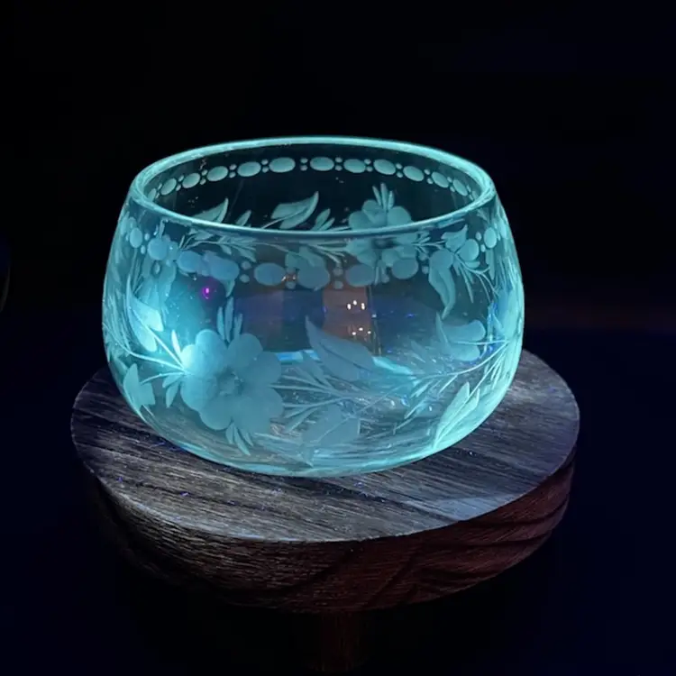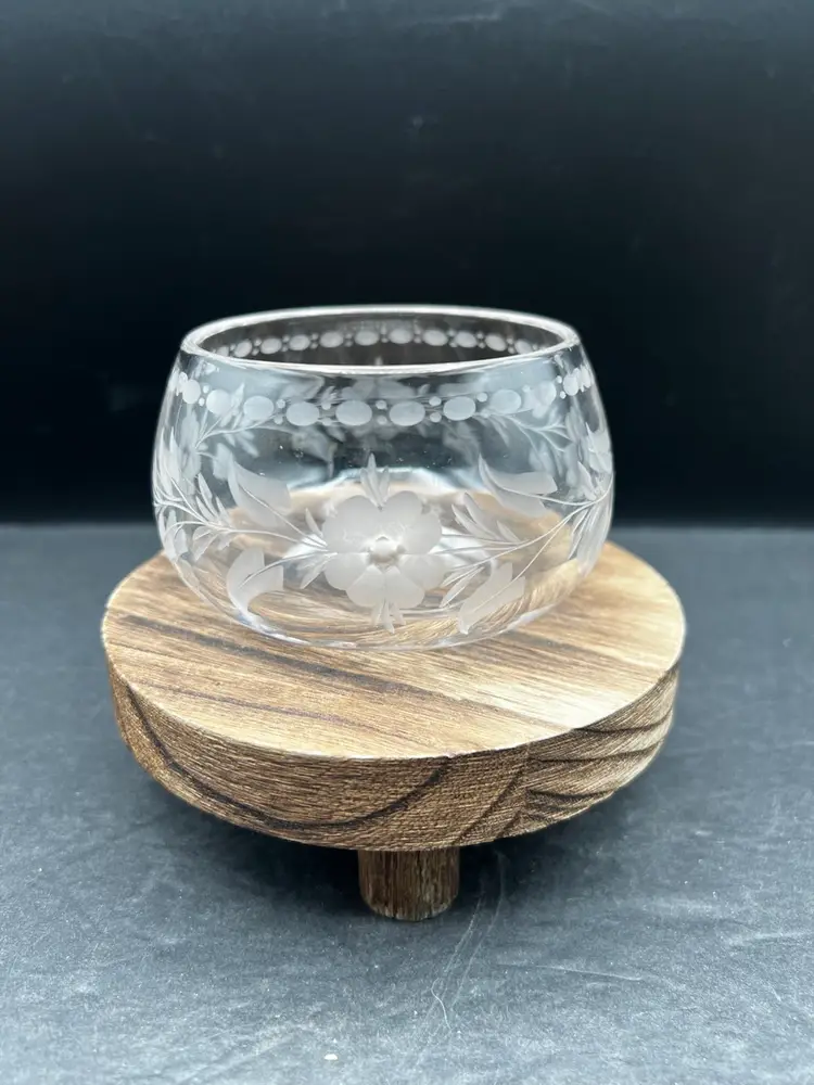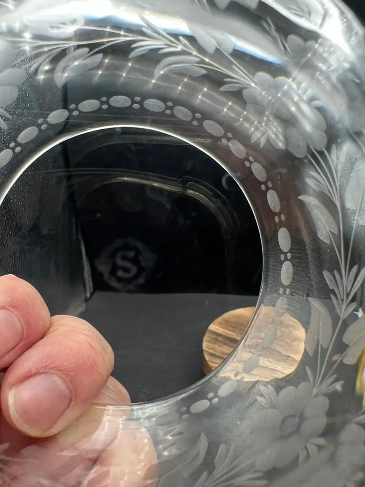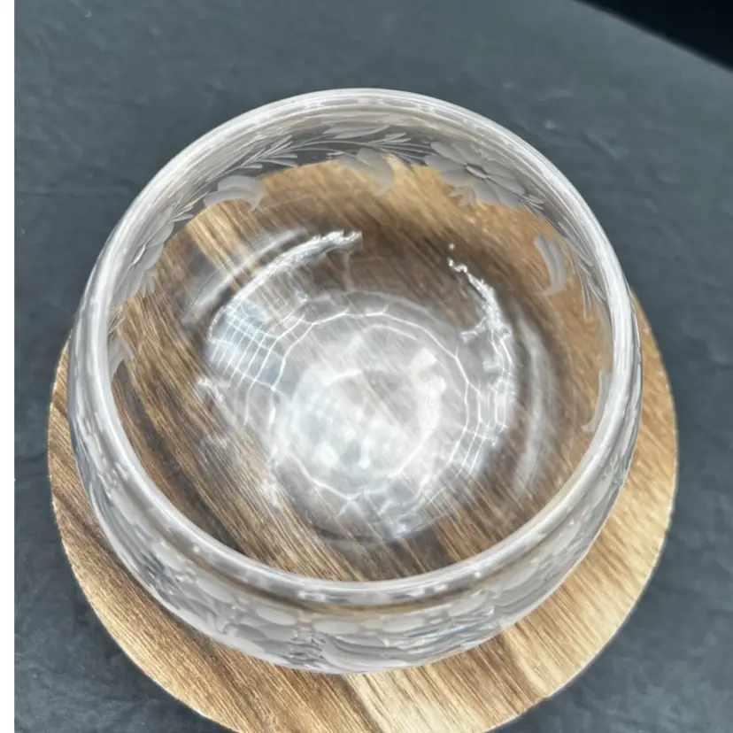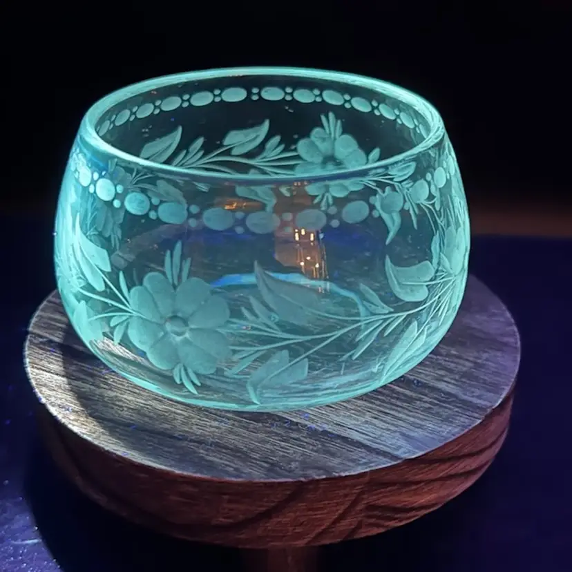 Vintage Floral Etched Clear Votive Holder. Marked With An S On Bottom. Very Pretty, Old And Has a Manganese Glow Unknown maker Good vintage condition, no chips or cracks, some surface scratches on bottom 2 1/2” tall x 3 1/2” in diameter, 3” at rim
