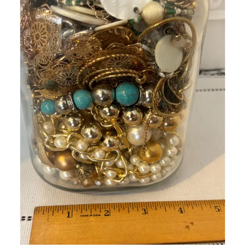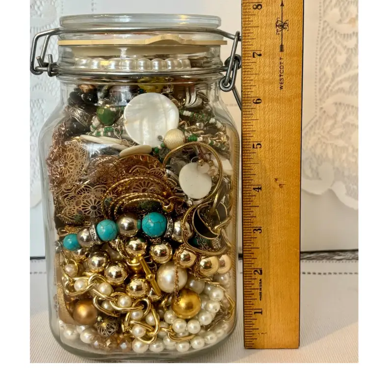 At least 30 pieces of wearable jewelry, unless I accidentally missed something Glass jar included! Weighs 5lbs. 10 ozs.