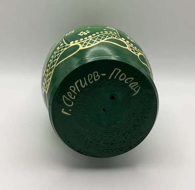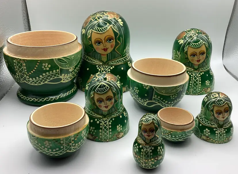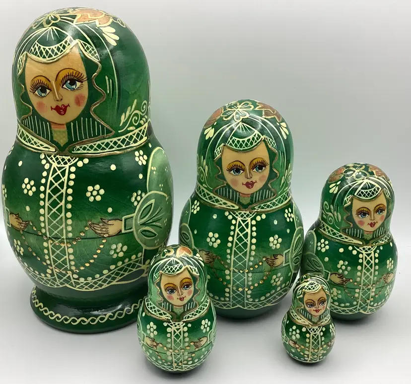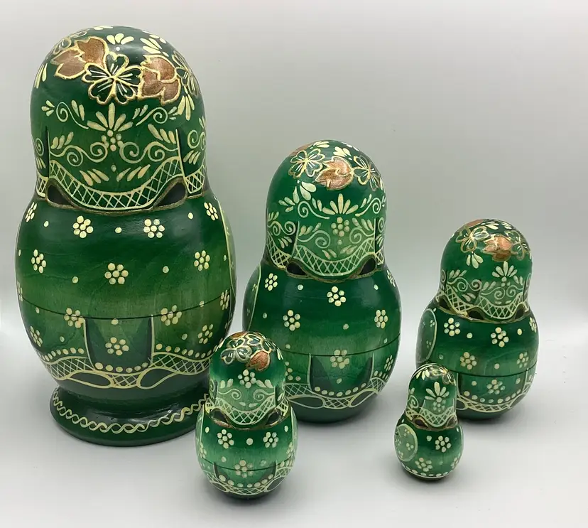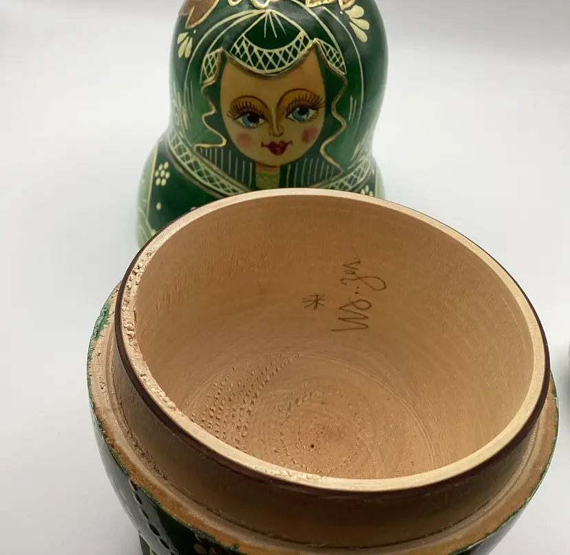 Signed: Yes Identifier: Marking on bottom / Sergiyev Posad (a historic city in Russia) Features: Hand painted / Detailed face Material: Wood Pattern/Design: Intricate details, scarf, arms, hands holding beads Color: Greens / Gold / Cream / Golden Brown Largest to smallest measurements, Large being #1 Measurements: Height - (1) 6”, (2) 4 and 1/4”, (3) 3 and 1/4”, (4) 2. and 1/4”, (5) 1 and 1/2” Width - (1) 3 and 1/4”, (2) 4 and 1/4”, (3) 3 and 1/4”, (4) 2 and 1/4”, (5) 1 and 1/2”