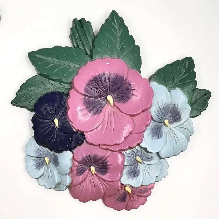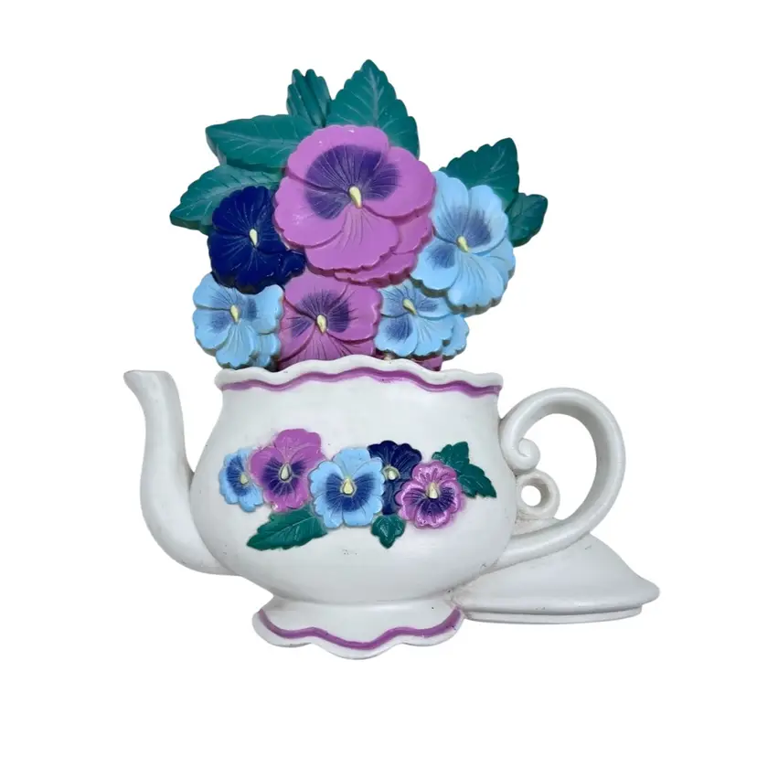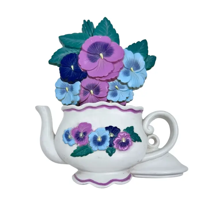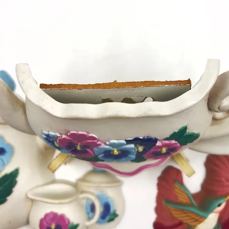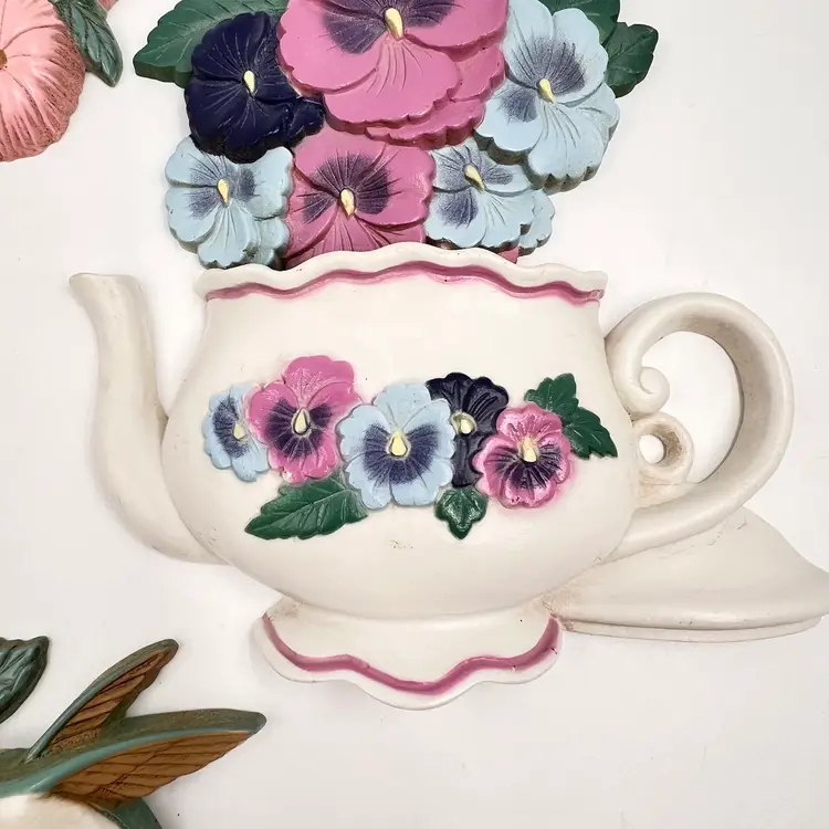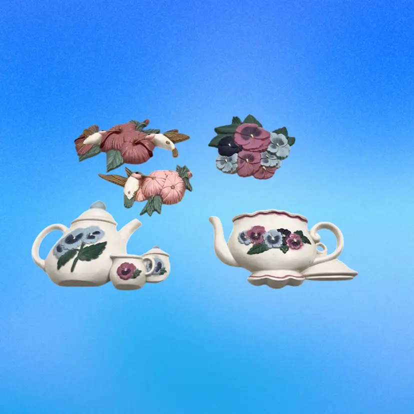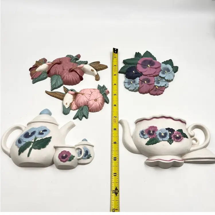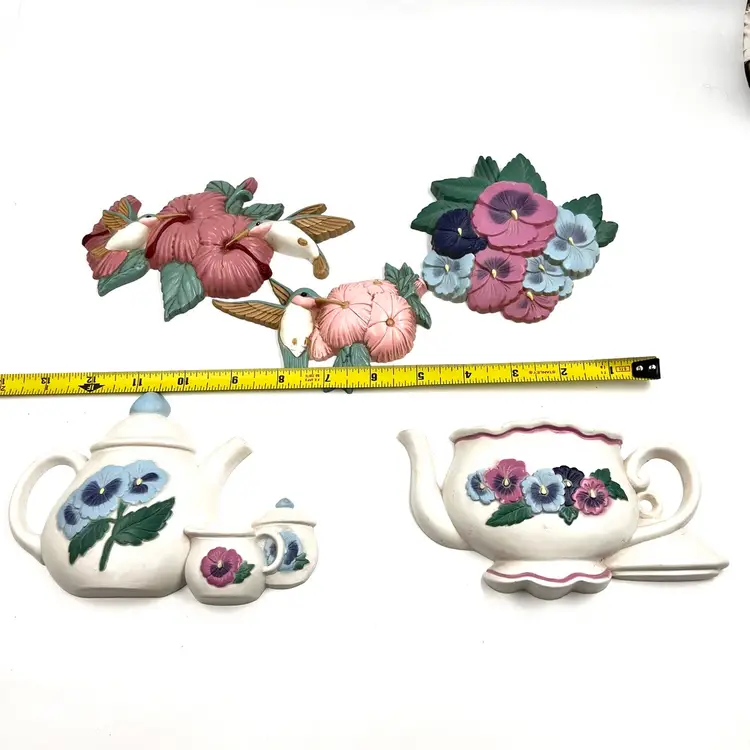 Teapot Wall Pocket 3 1/2”H x 7”W Teapot/Sugar/Creamer Wall Decor 5”H x 6 1/2”W Flowers w/ 2Hummingbirds Wall Decor 4”H x 6”W Flowers w/ 1 Hummingbird Decor 3”H x 5”W Pansies Wall Decor 5”H x 4”W 👉 Plastic Birds Flowers 👉No Chips or Cracks 👉Review Photos for Best Condition Description 👉Sold as Shown
