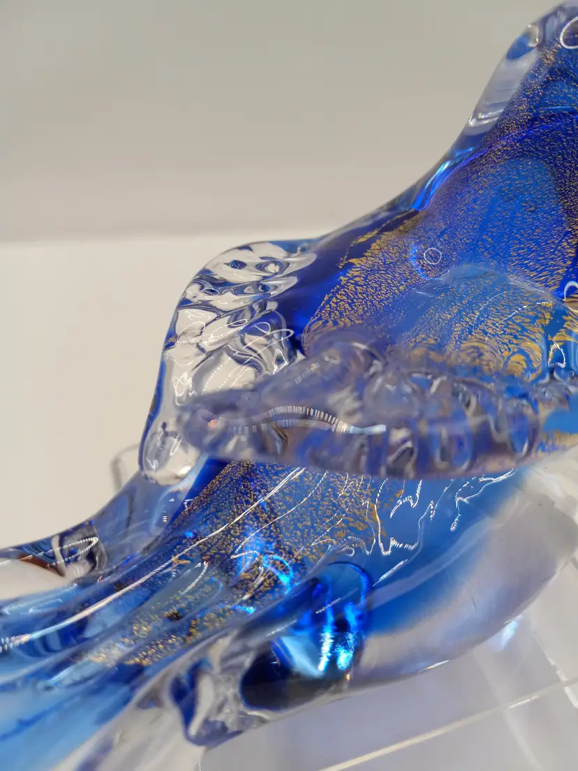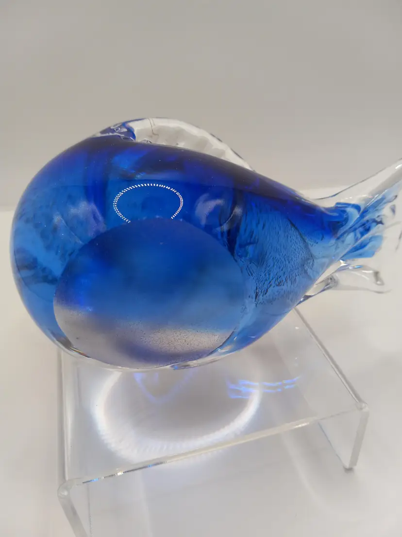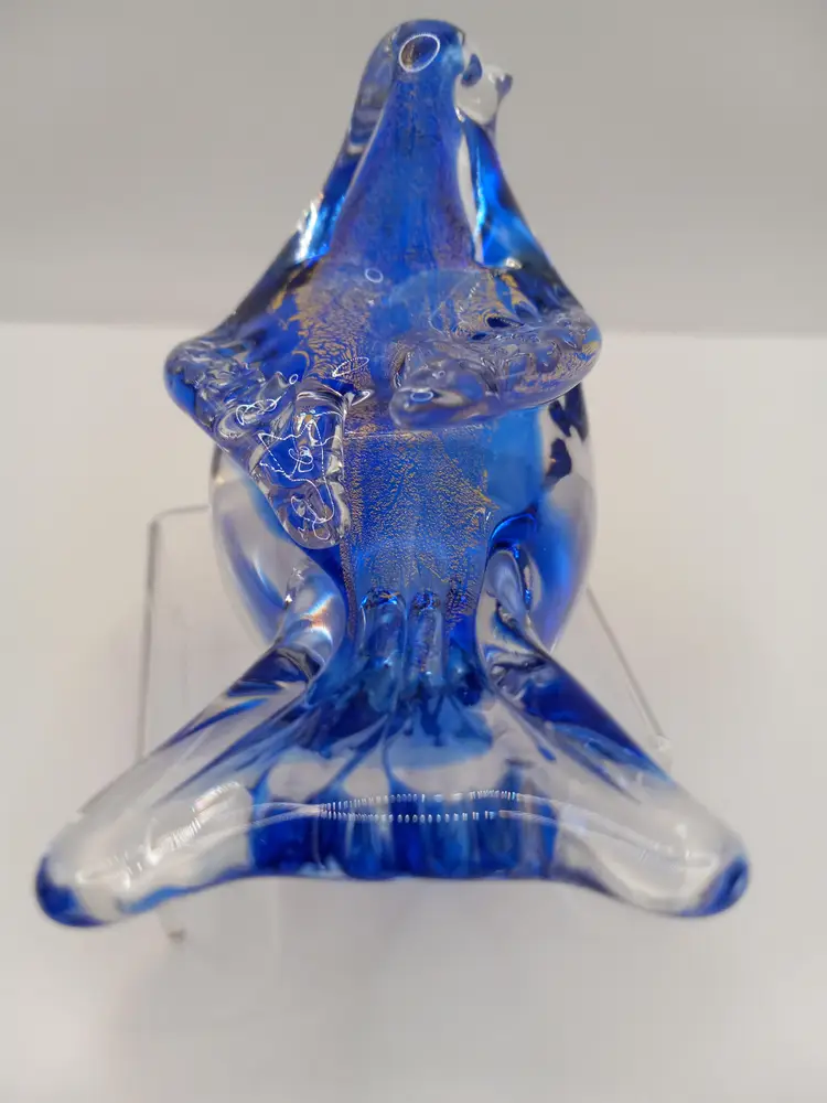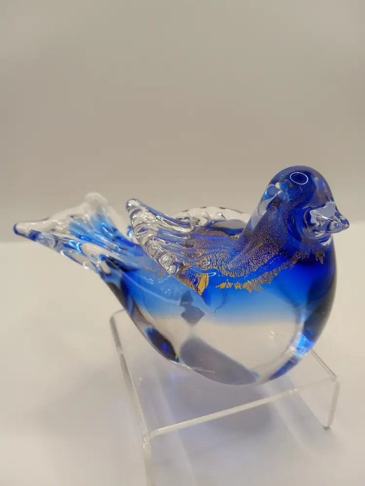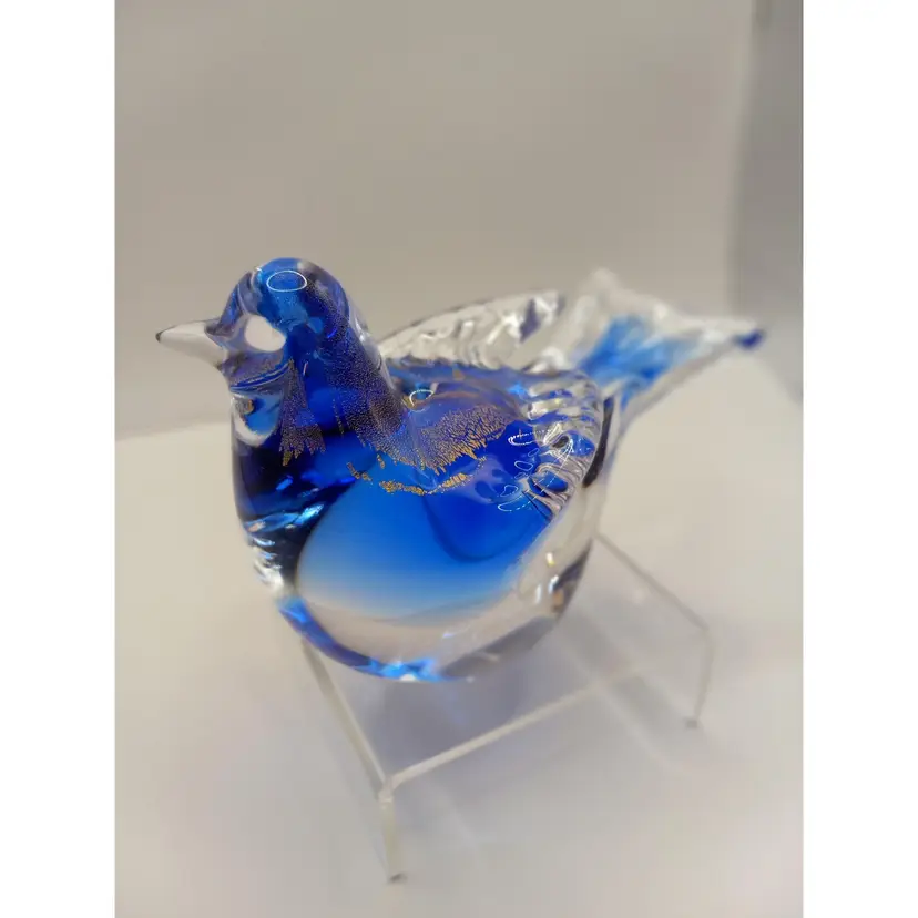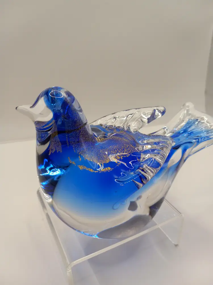 This is a beautiful piece of glass art. It is a clear glass bird design with cobalt blue and gold flecks. This stunning paperweight by Fifth Avenue Crystal boasts a beautiful blue dove design that is sure to catch anyone's eye. Made of high-quality blown glass, this vintage piece is perfect for collectors or as a unique addition to any home decor. Whether you're a fan of birds or simply appreciate the beauty of art glass, this paperweight is a must-have. Small surface scratch on one side that is hard to see. No chips. Measures 5.5"LX 3.75"T X 2.5"W