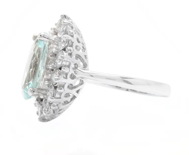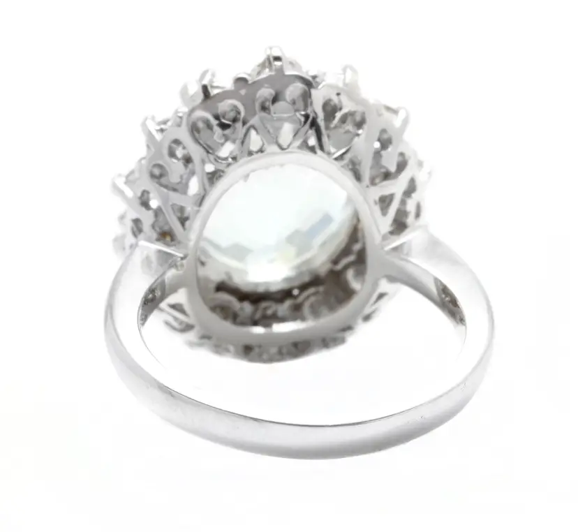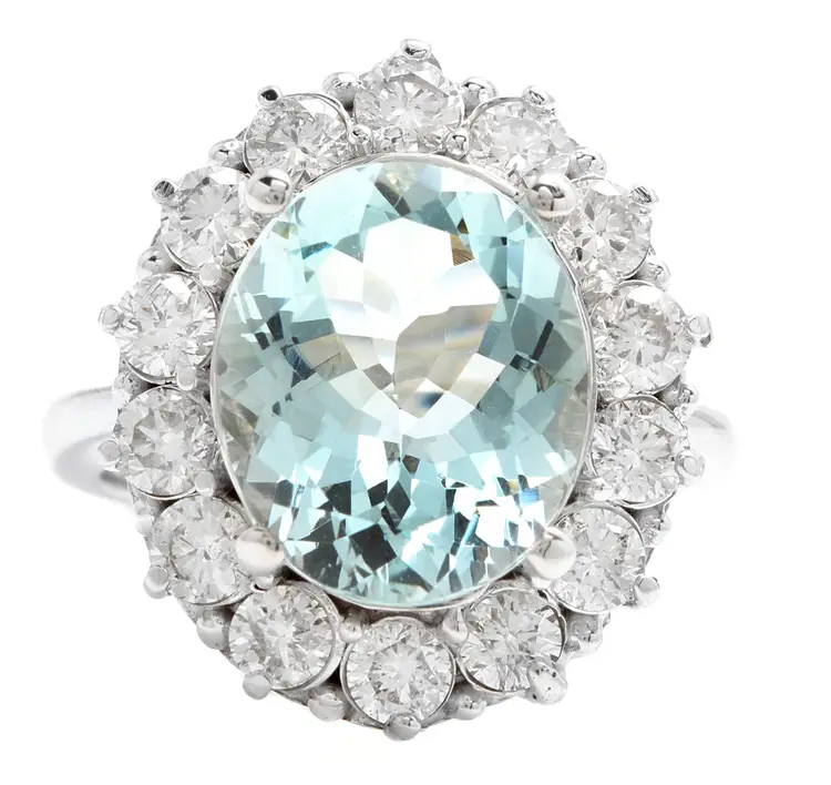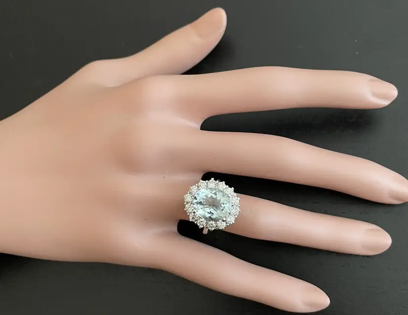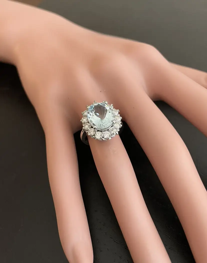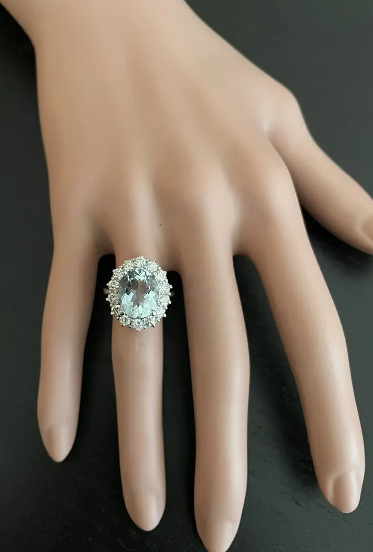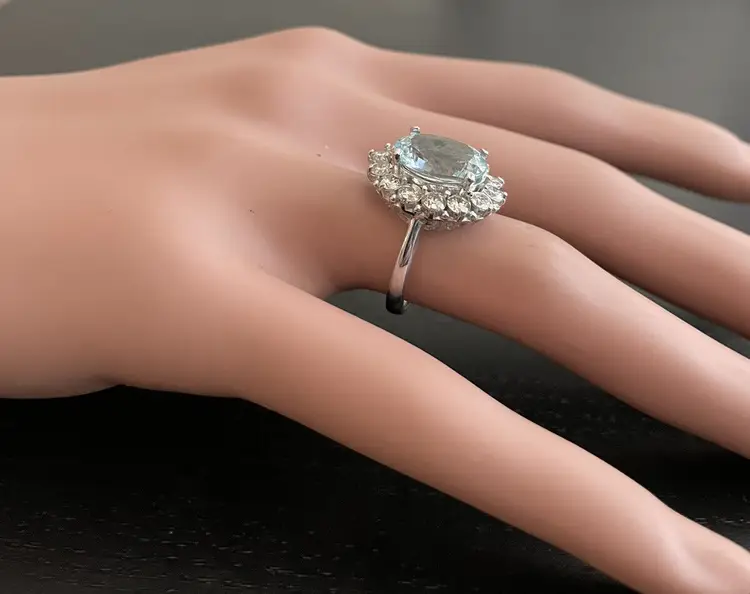 Main Stone Creation: Natural Metal Purity: 14k Style: With Diamonds & Gemstones Metal: White Gold Secondary Stone: Aquamarine Main Stone: Aquamarine Total Carat Weight (TCW): 6.15 Sizable: Yes Main Stone Treatment: Heating Country/Region of Manufacture: United States Main Stone Shape: Oval Ring Size: 7 Main Stone Color: Blue Type: Ring Brand: Unbranded