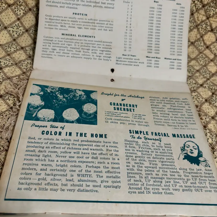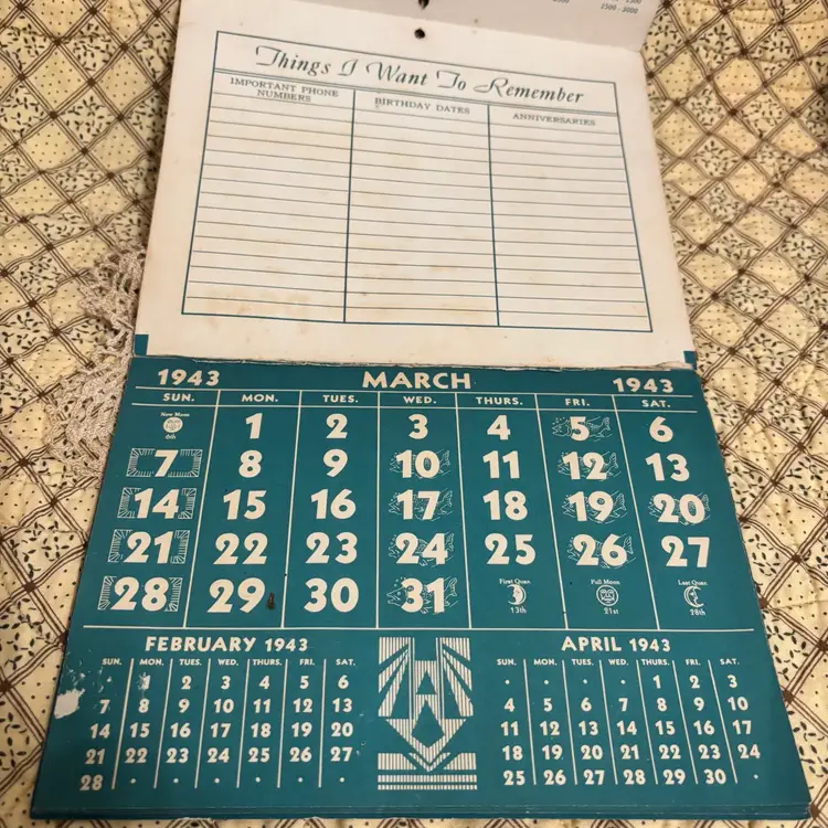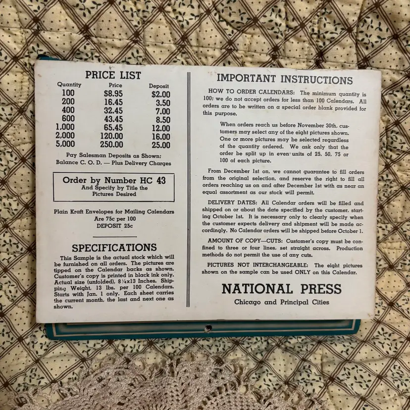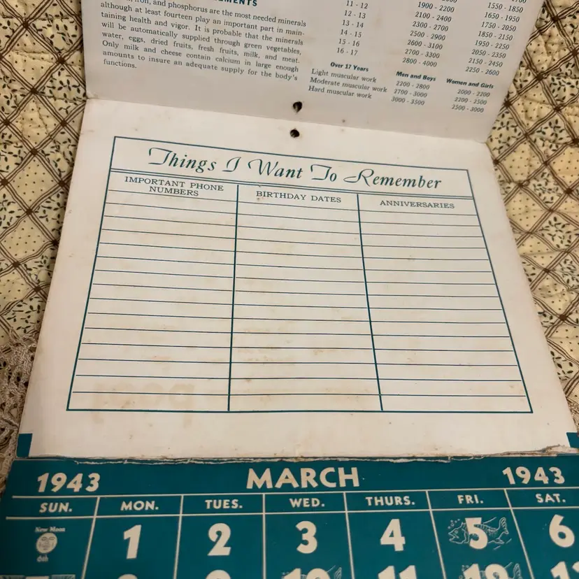 This 1943 salesman sample advertising calendar is missing Jan and Feb. In good vintage condition. Great holiday recipes and hints for entertaining. Good condition other than 2 missing month pages- no rips or tears. Fun for crafting. 8” x 7”.