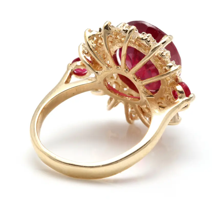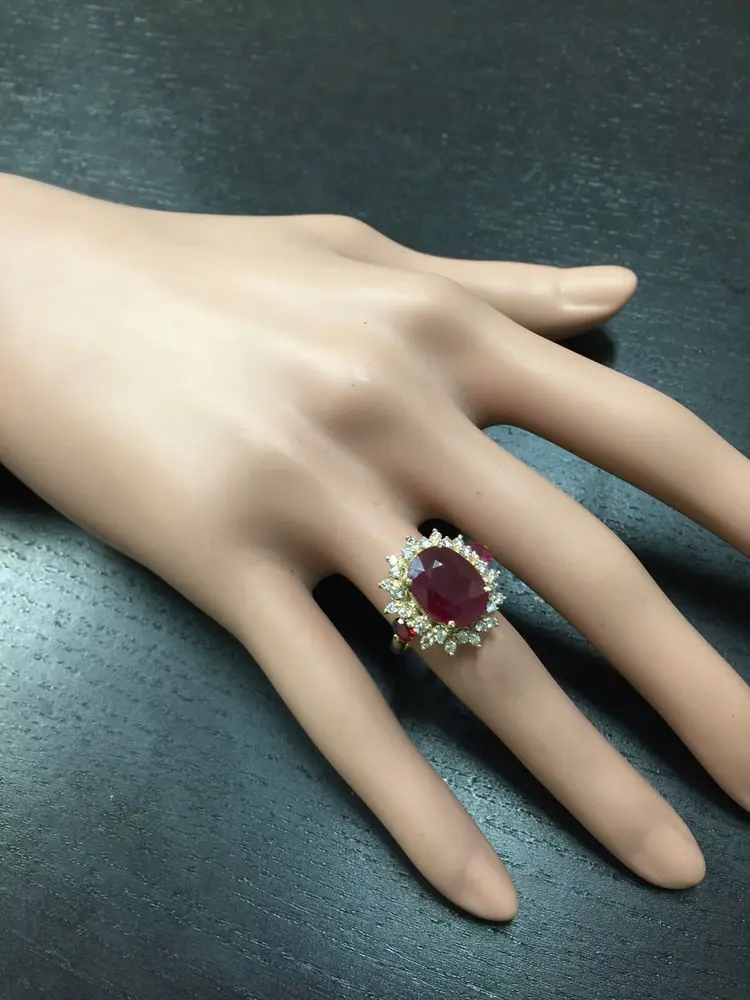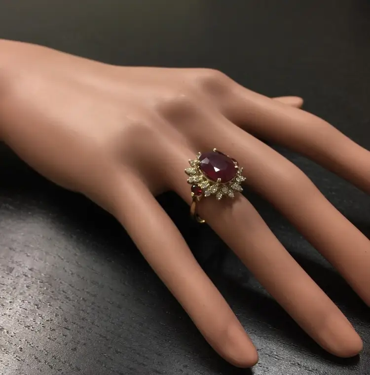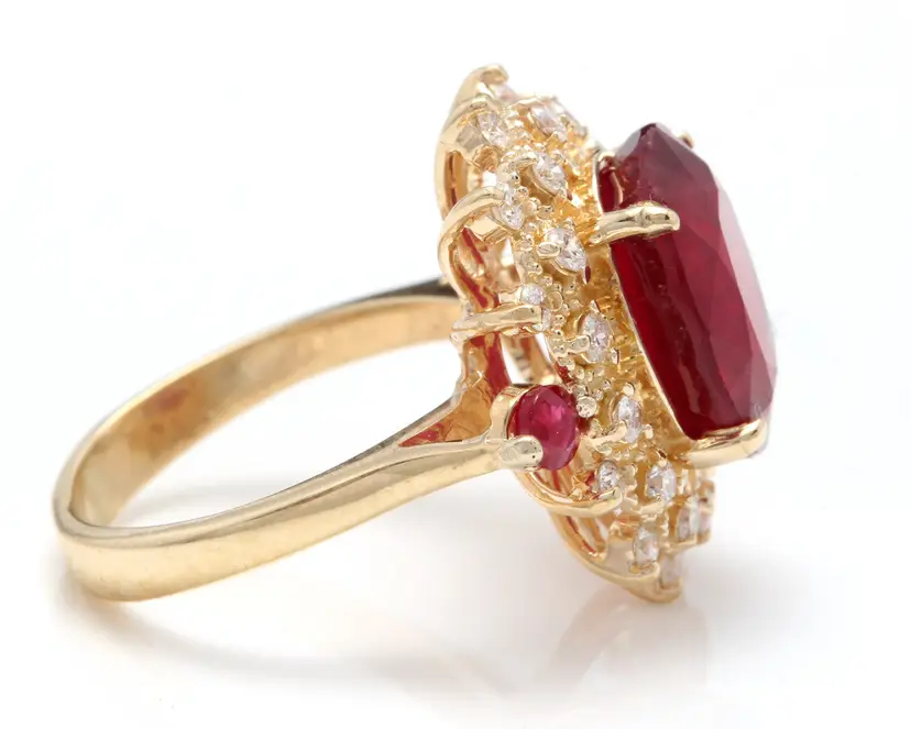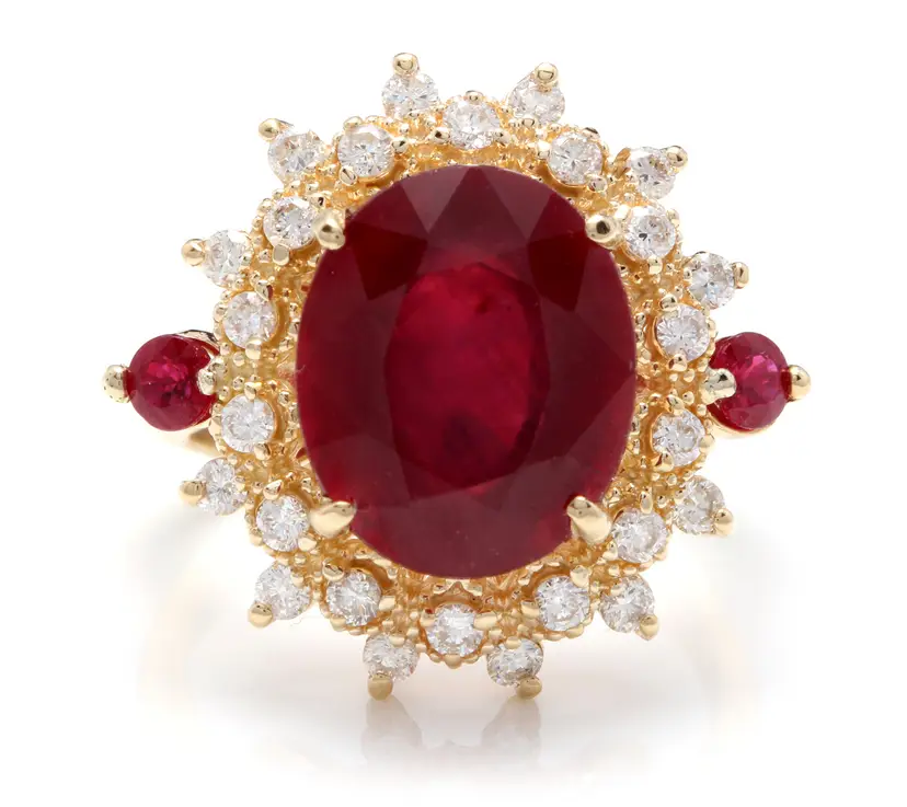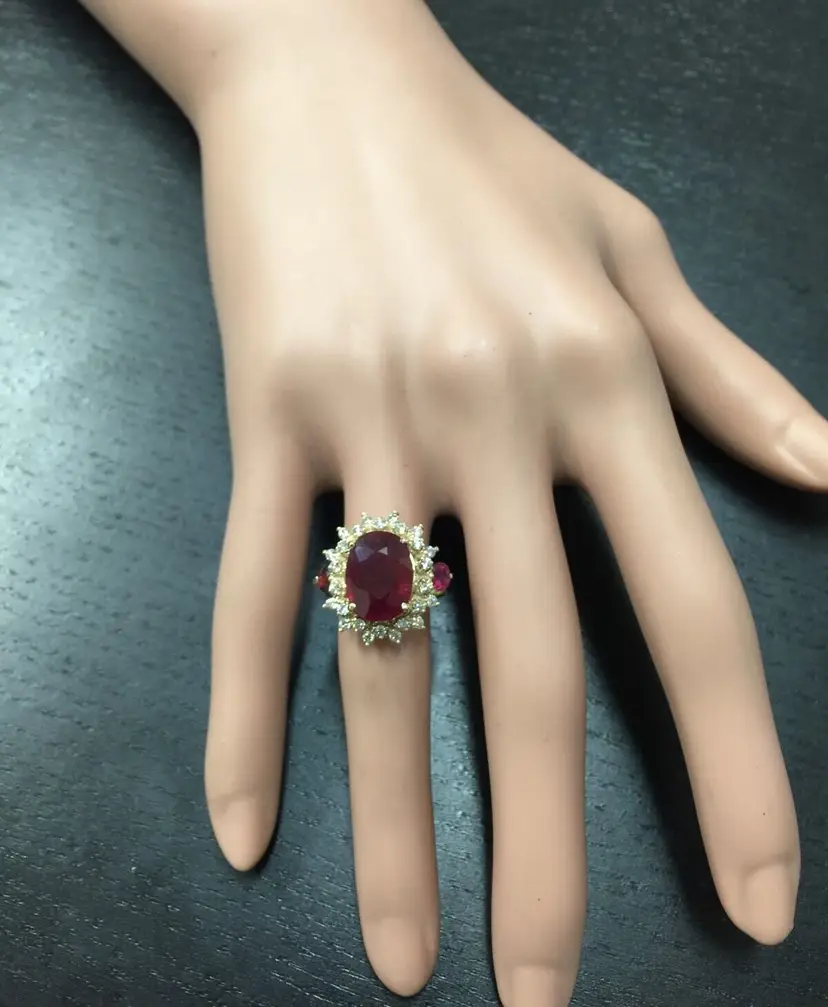 Metal: Yellow Gold Metal Purity: 14k solid gold Sizable: Yes Main Stone: Ruby Total Carat Weight (TCW): 6.70 Main Stone Shape: Oval Main Stone Color: Red Ring Size: 6.5 Main Stone Creation: Treated Main Stone Treatment: Lead Glass Filling Brand: Unbranded Type: Ring