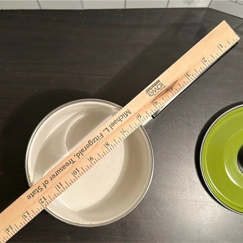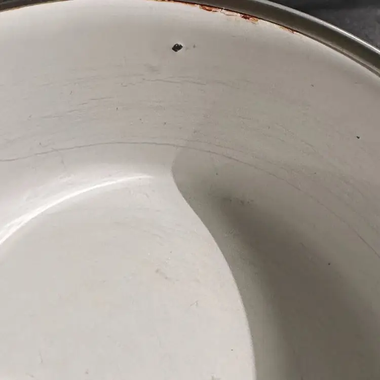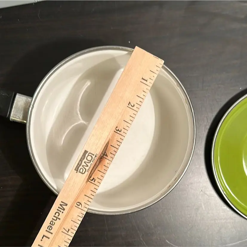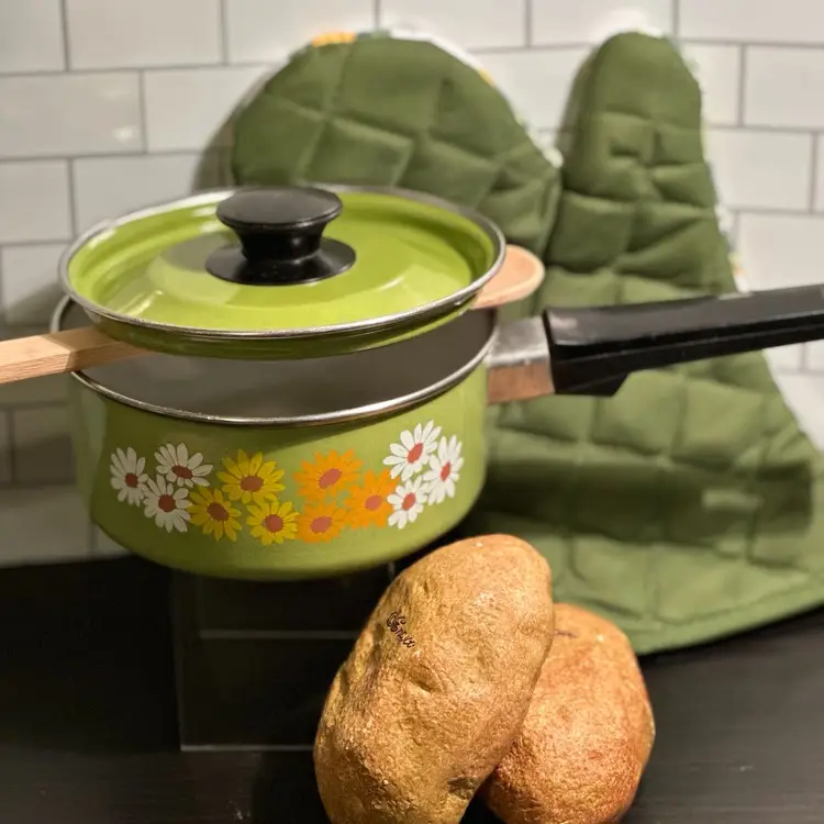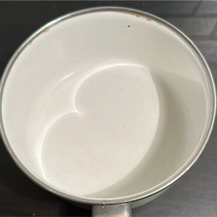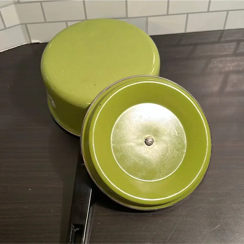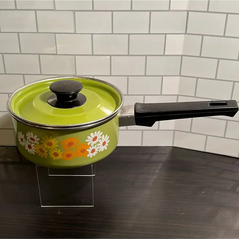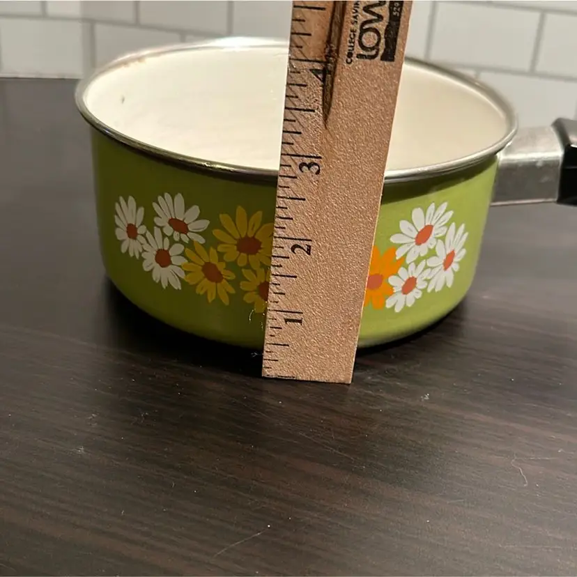 This unmarked vintage saucepan is decorated with white, yellow, and orange daisies. There is some rust around the inside rim and one chip to the enamel as shown in the pictures. Measures 6” in diameter, 3” tall, and 12” long with the handle.
