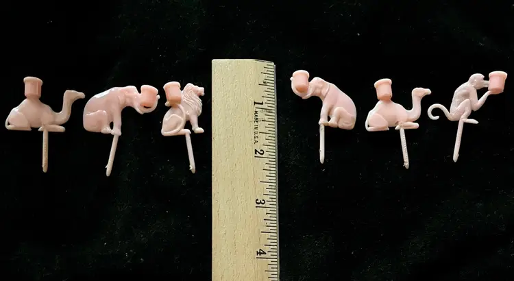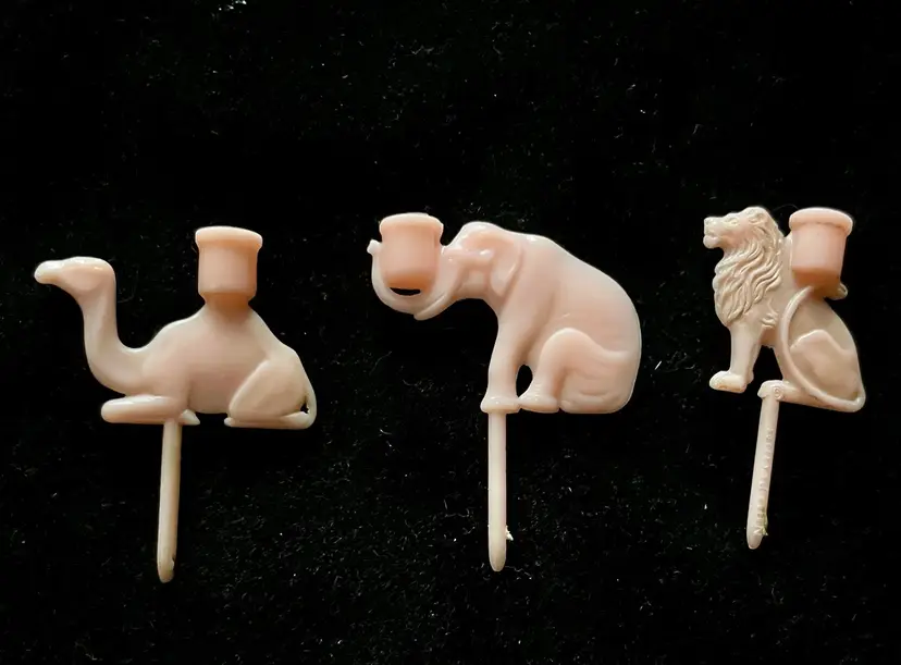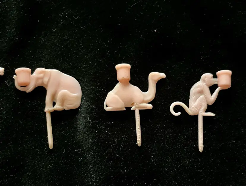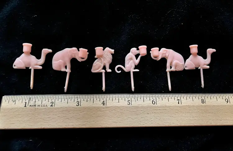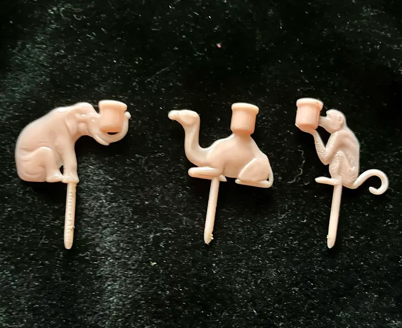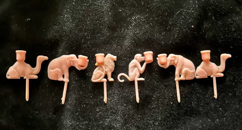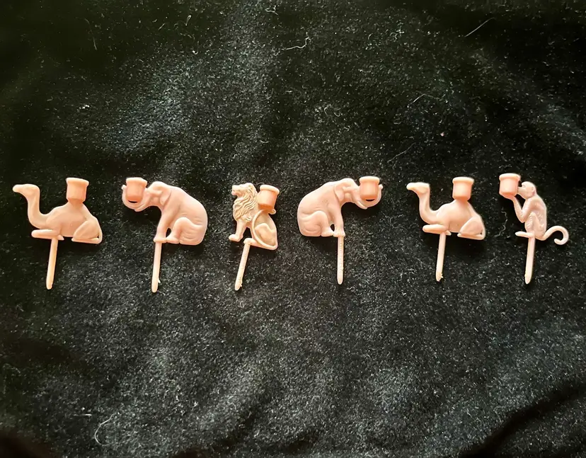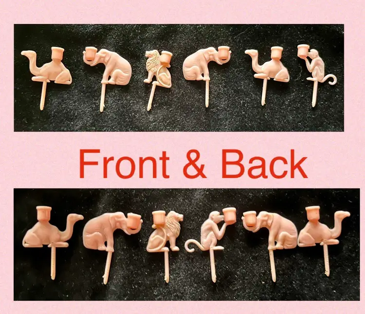 Add a touch of whimsy to your party treats with these adorable animal cake picks. Whether you're hosting a kids' birthday or a casual get-together, these playful toppers are perfect for adding a bit of fun to your cupcakes or cakes. With six vibrant pink candle picks are for very small candles and a regal lion, monkey, elephant, and camel, all made of durable plastic that's easy to clean and reuse - these have been soaked briefly in dental cleaner but some icing dyes are still visible in areas.