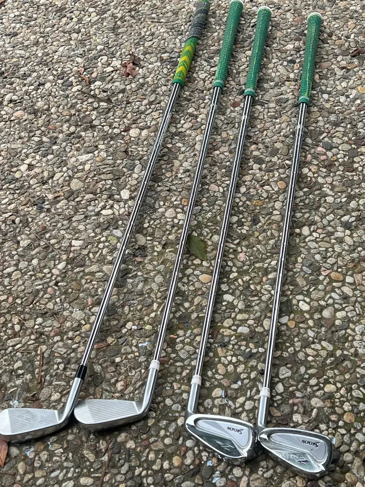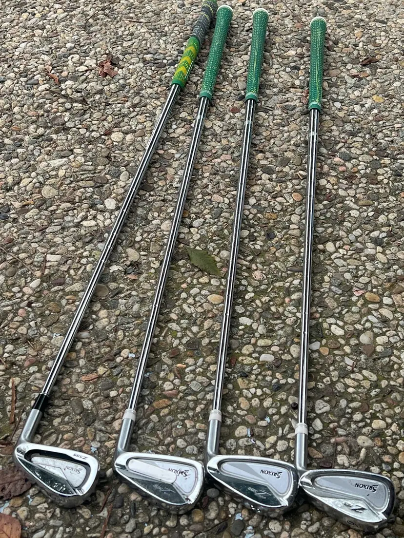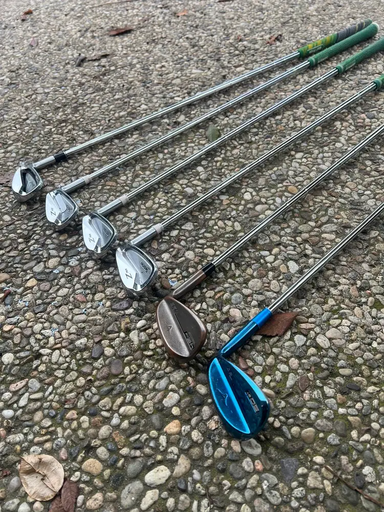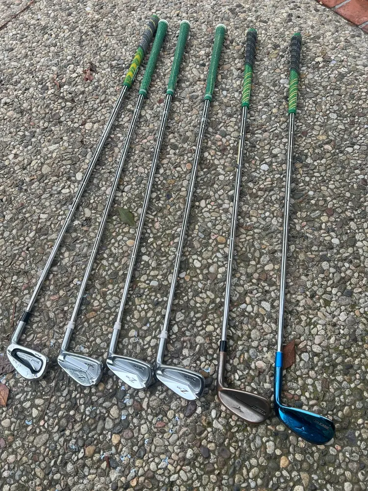 Srixon Z585 6 iron. Srixon Z765 7-9 irons. Mizuno copper T22 4608 pitching wedge. Mizuno blue ion T20 5007 gap wedge.