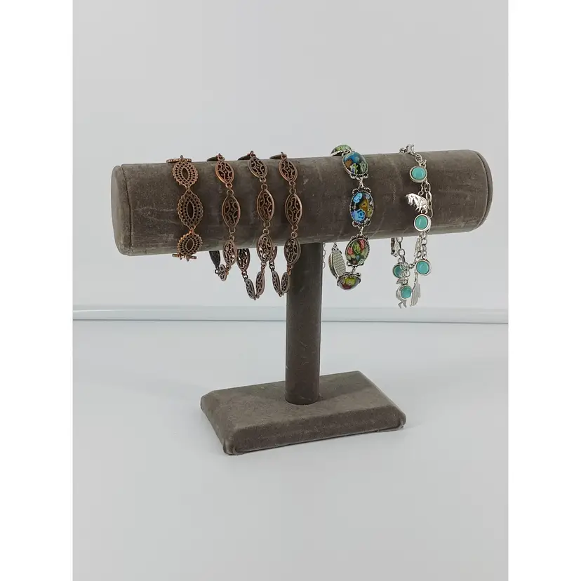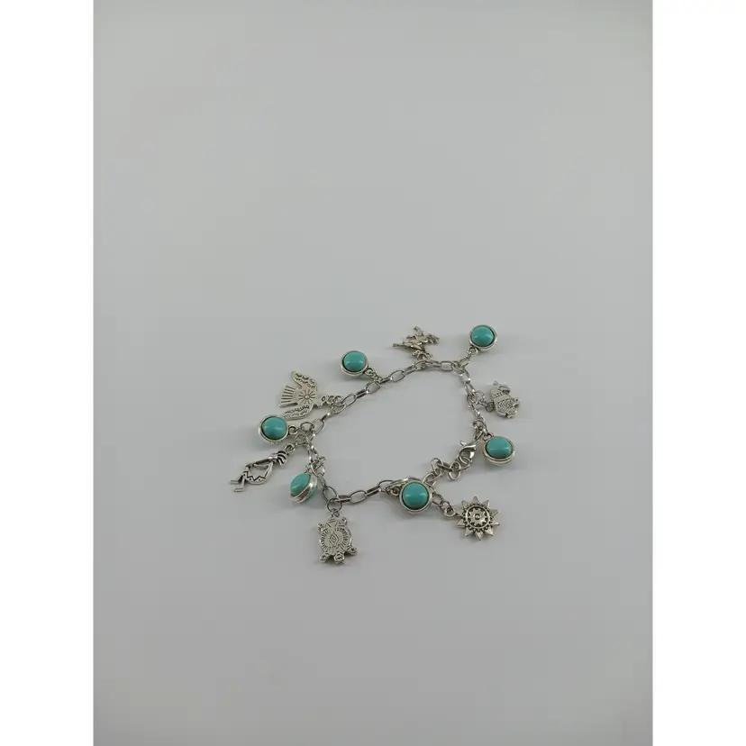 BM366 – 5/16 x 3/16-inch African Turquoise cabochons have been mounted on both sides of a 1/2x 3/8-inch antique silver cabochon pendant. Six of those pendants along with six antique silver-plated charms have been linked to make these 7 1/2inch charm bracelets. Charms range from 3/8 x 5/8 to 7/8 x 13/16 inches and include a Buffalo, horse, Thunder bird, Kokopelli, turtle and sun.