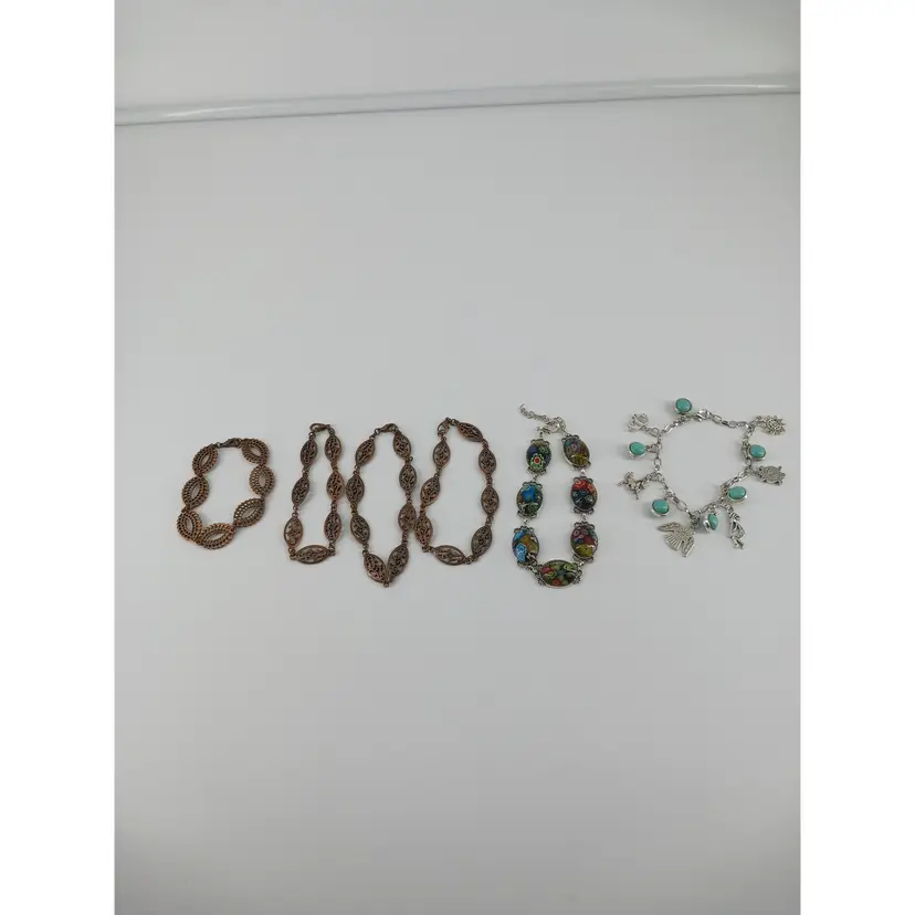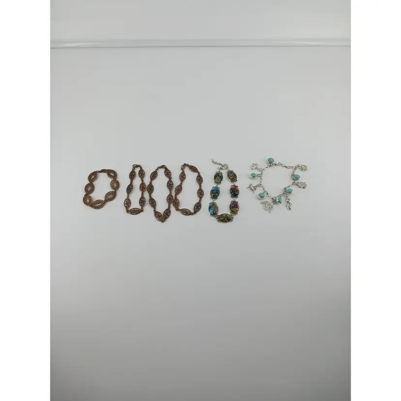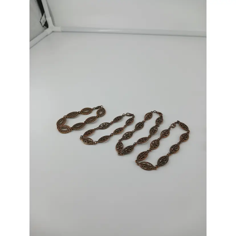 BM370 – 1 x 3/8-inch Copper double sided filigree link has been linked with other same links to make these 7 1/2inch bracelets.