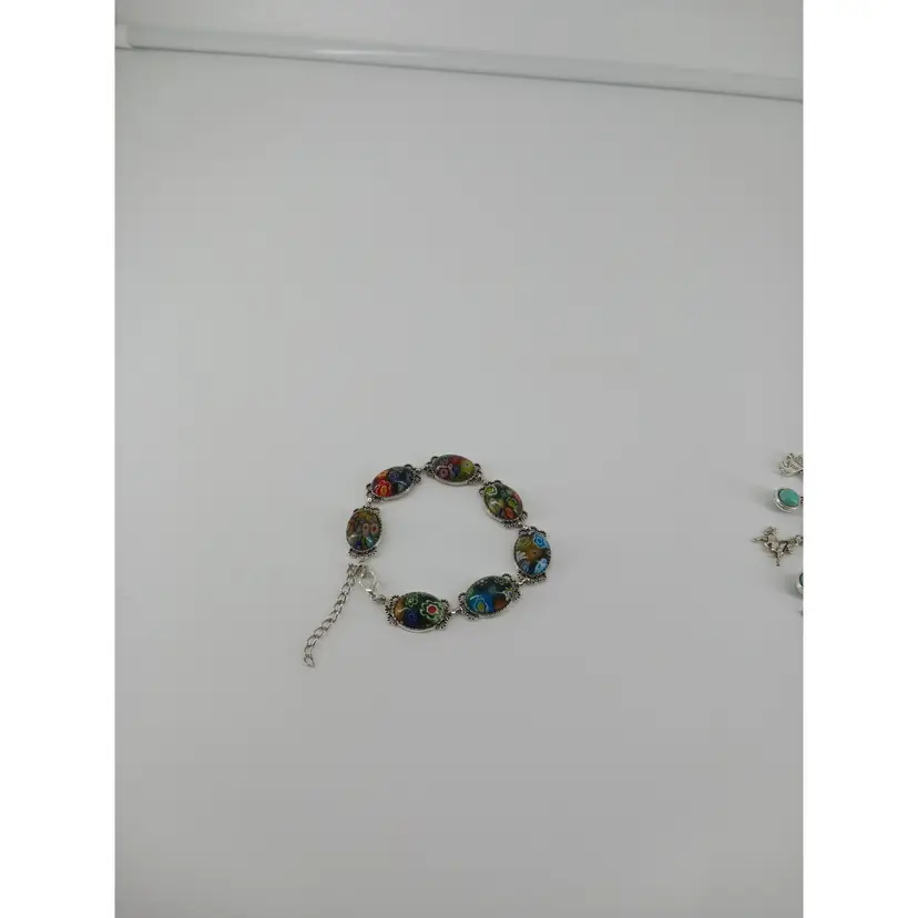 BM387 – 3/4x ½ x3/16-inch Rainbow Millefiori Glass Cabochon has been mounted into a 1 1/8 x 7/8-inch antique silver cabochon link settings and has been linked together to make these 8 1/2inch bracelets and has an extra 2-inch extension chain for added length.