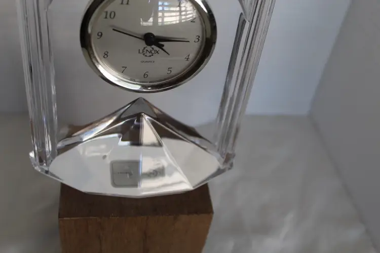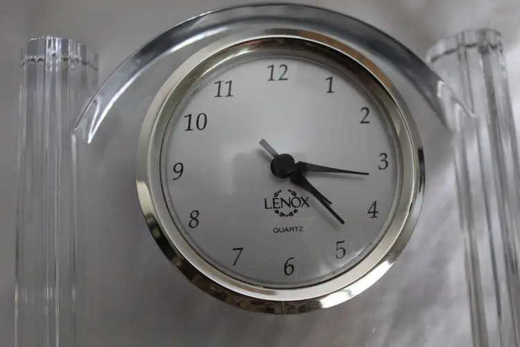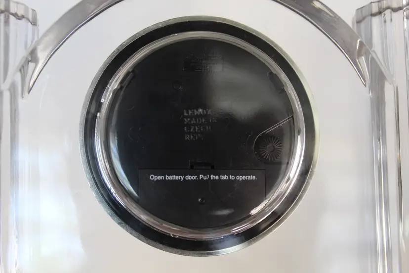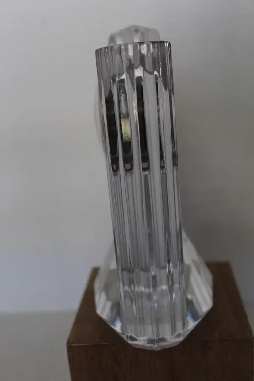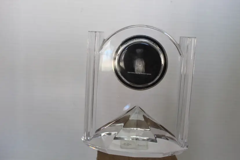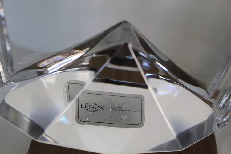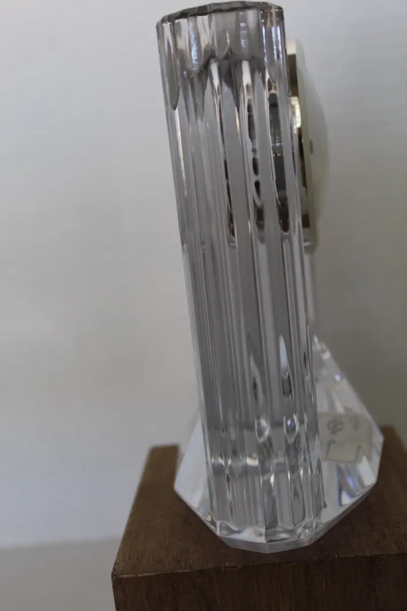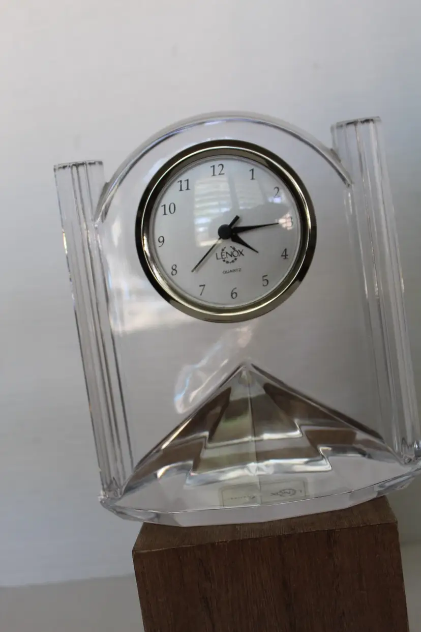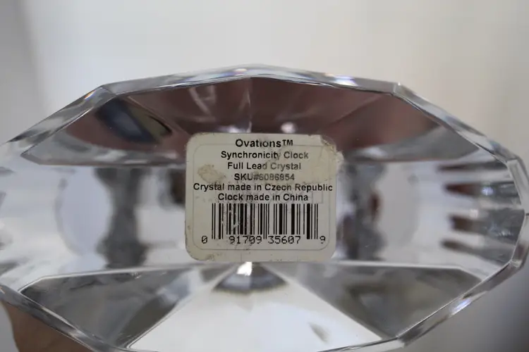 This vintage Lenox 6" Full Lead Crystal Synchronicity Clock is a stunning piece with a retro design. The clock features a battery-operated quartz movement, clear crystal frame, and glossy finish. Made in 1985, this desk, mantle or table clock adds a touch of elegance to any room with its vintage charm. The clock was manufactured in Czech Republic and designed by Lenox, known for producing high-quality crystal pieces. Perfect for collectors of decorative clocks or those looking to add a unique accent to their home decor. Original stickers still on the bottom and clock works perfectly.