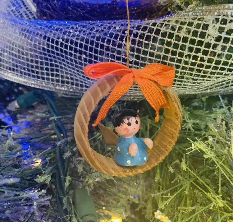 The blue ornament the gold thread loop has come undone. It’s still there but only one side is attached. Could be tacked down with small dab of glue.