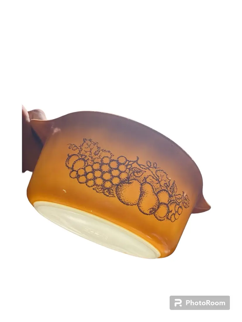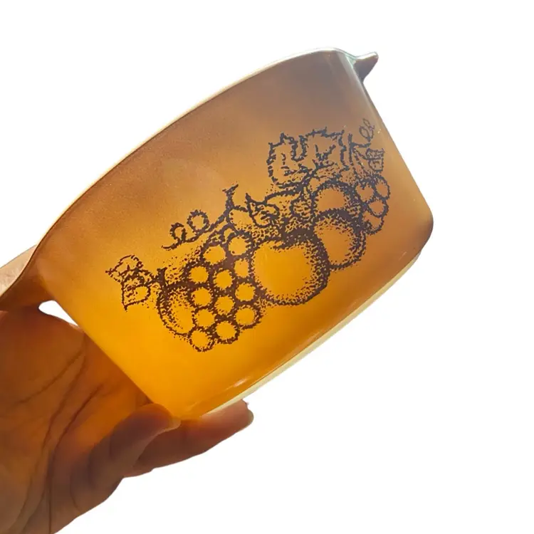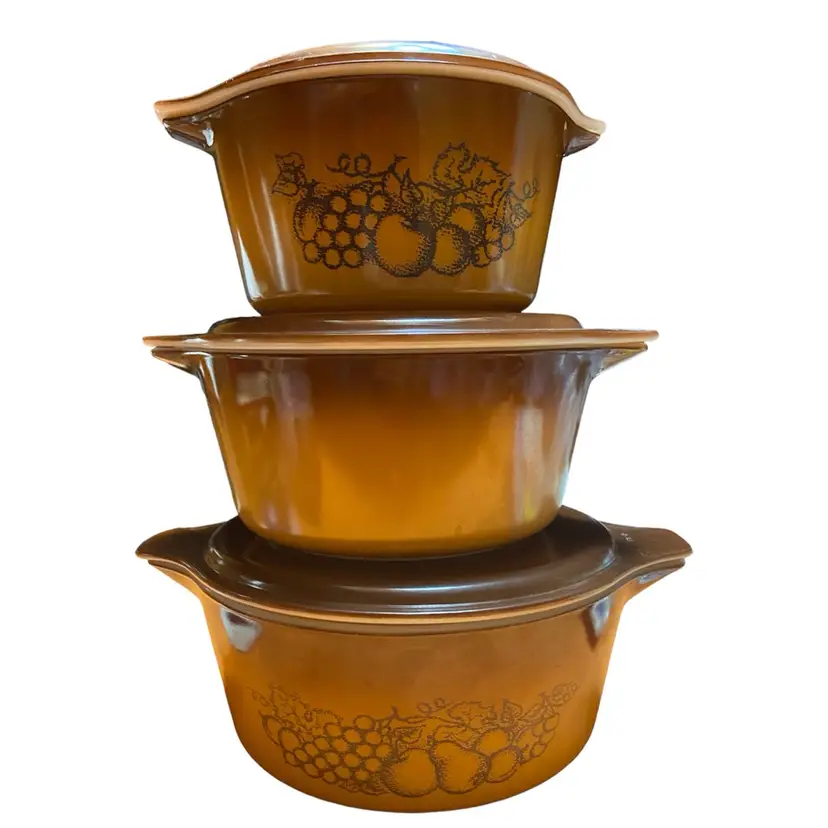 Each dish has handles for easy serving. Made of durable glass, this set which was produced in the United States from 1974 to 1978 and designed by Estelle Rothstein, features a glossy finish.