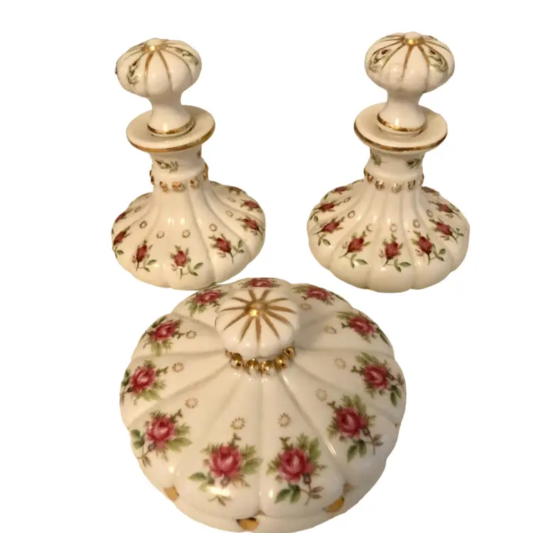 2 matching porcelain perfume bottles with porcelain daubers. Stands approx 5" tall. I chips or cracks