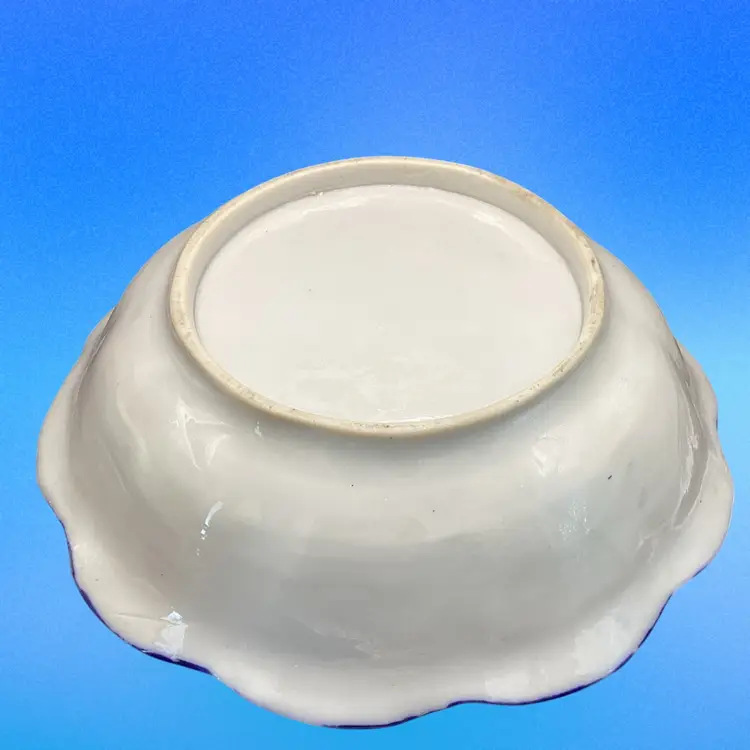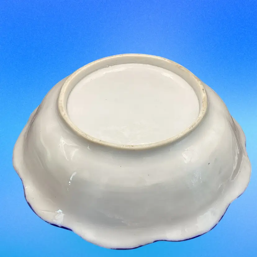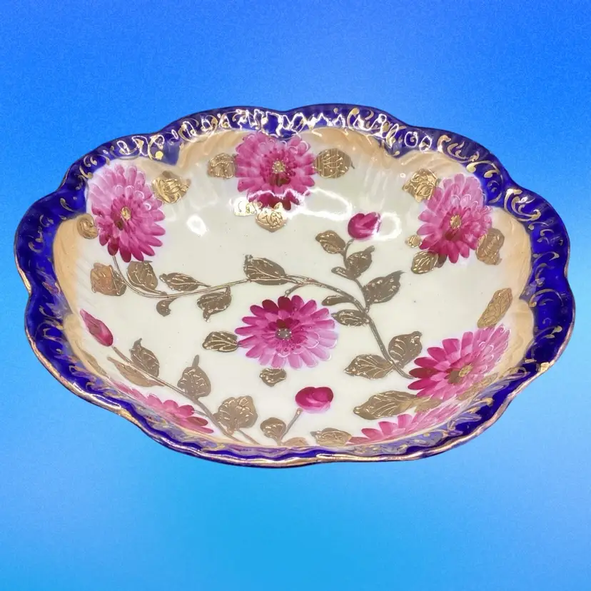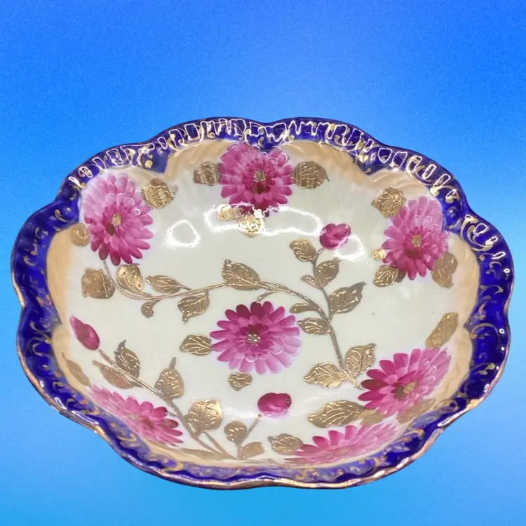 This vintage cobalt porcelain dish features hand-painted gold leaf floral designs with scalloped edges. The set includes a round bowl with a diameter of 8 inches, perfect for serving various sauces, also included are 5 matching sauce bowls. The multicolor dish exudes a Victorian style with a painted finish, making it a unique and charming addition to any collection or dining table. Handmade with attention to detail, this original piece is sure to add a touch of elegance to any occasion. This set is in good vintage condition, a few flaws but no chips or cracks.