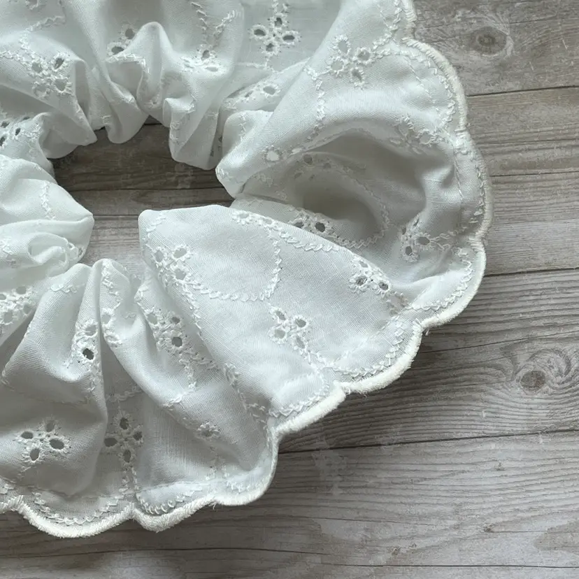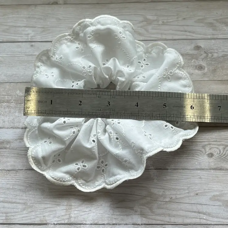 These white eyelet lace scrunchies are hand made from new old stock vintage eyelet lace. They are stretchy and fluffy. Approximately 6.5 inches across Wholesale cost per unit $2 Suggested Retail Price per unit $8 Made in the USA