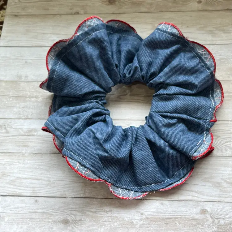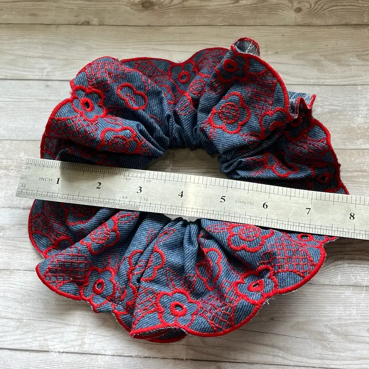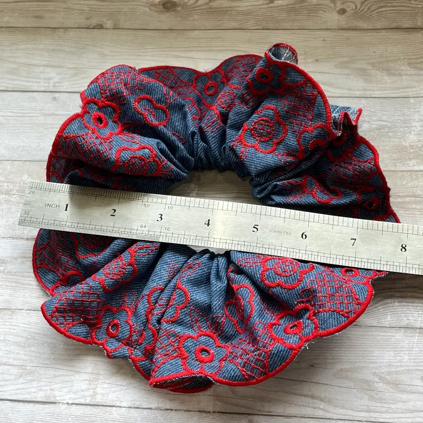 You will receive 6 scrunchies. These XL scrunchies measure 8 inches across. They are hand made from a full yard new old stock vintage embroidered fabric edging. Features beautiful red embroidered flowers on a light weight denim background. Has stretchy elastic inside. Handmade in the USA Wholesale $4 per unit Suggested retail $12 per unit