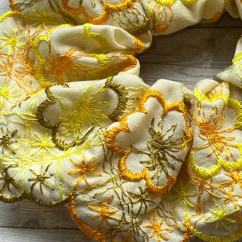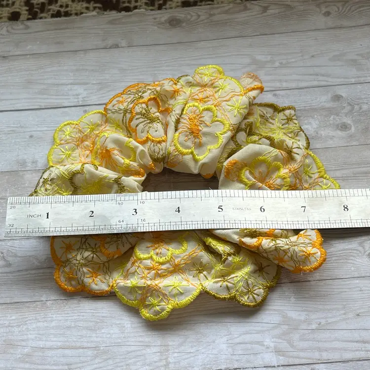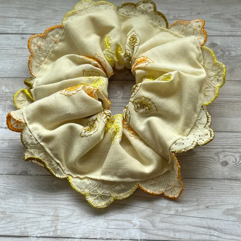 This is a six piece lot. Each scrunchie is handmade from embroidered new old stock vintage fabric. Scrunchie measures approximately 7 inches across Stretchy elastic inside. Handmade in the USA. Wholesale price per unit $4 Suggested Retail Price per unit $12