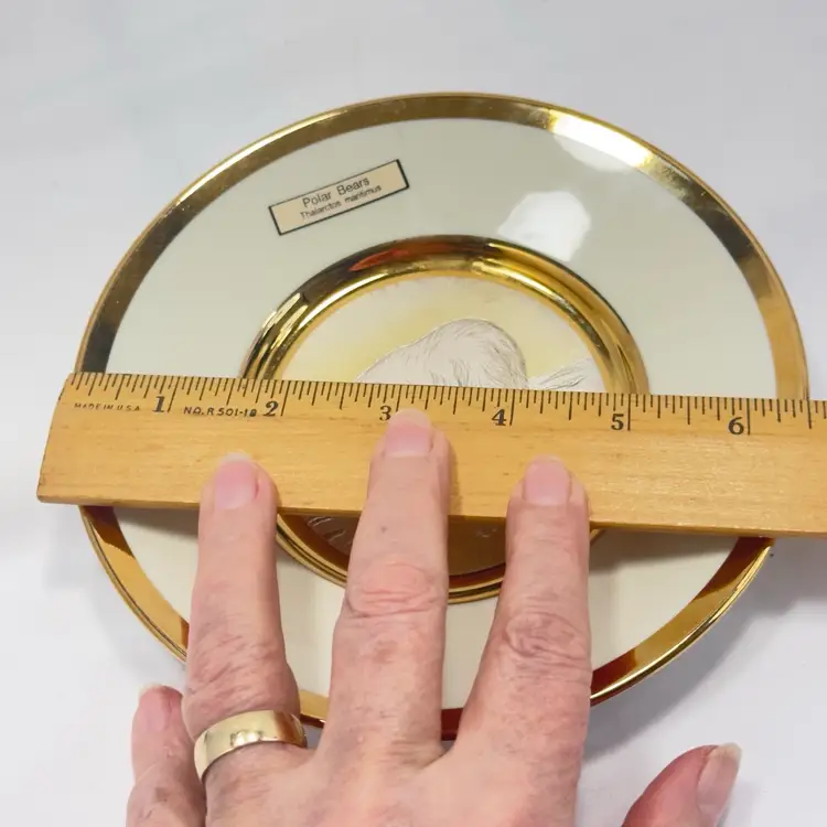 Plate is 6.5" and 8oz, no chips or cracks, may have some wear marks in the gold due to age and wear