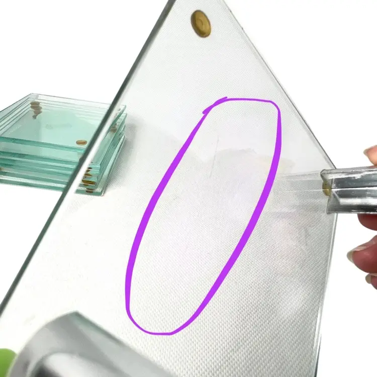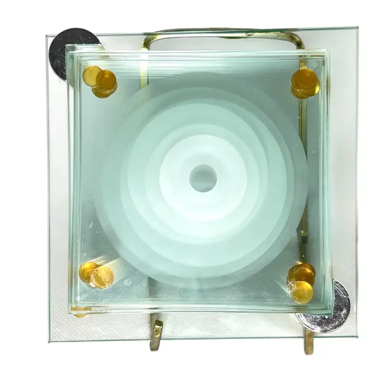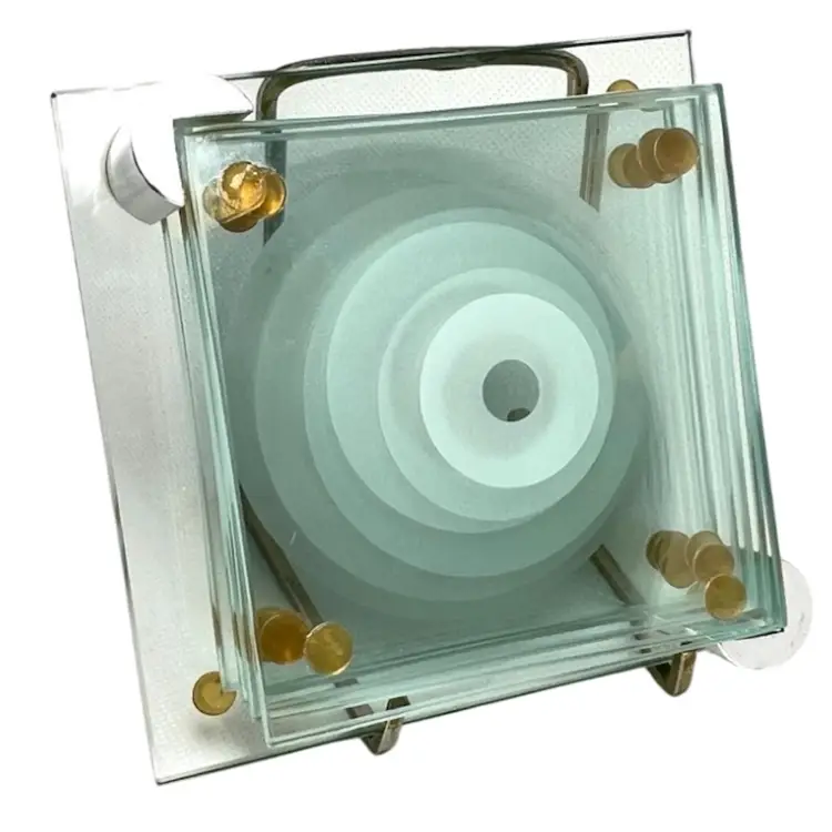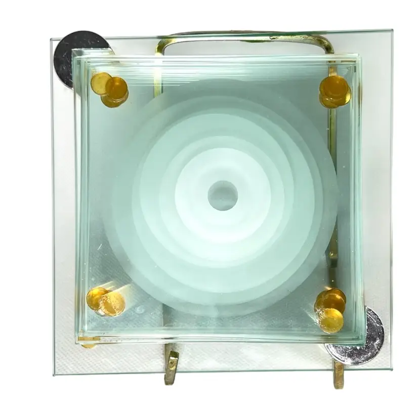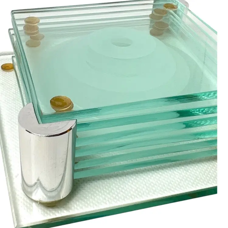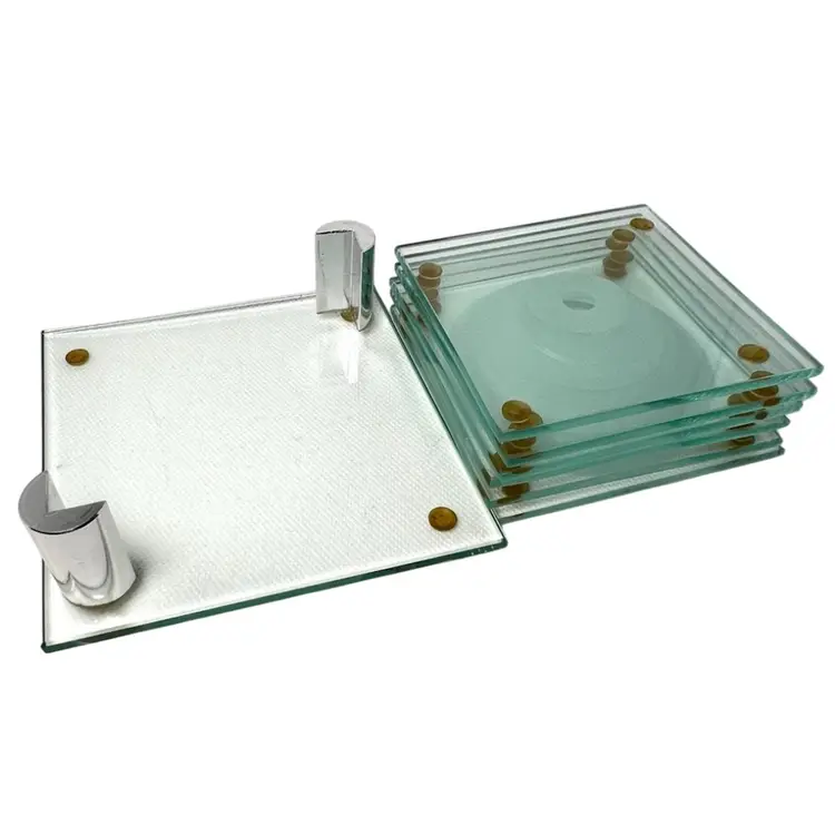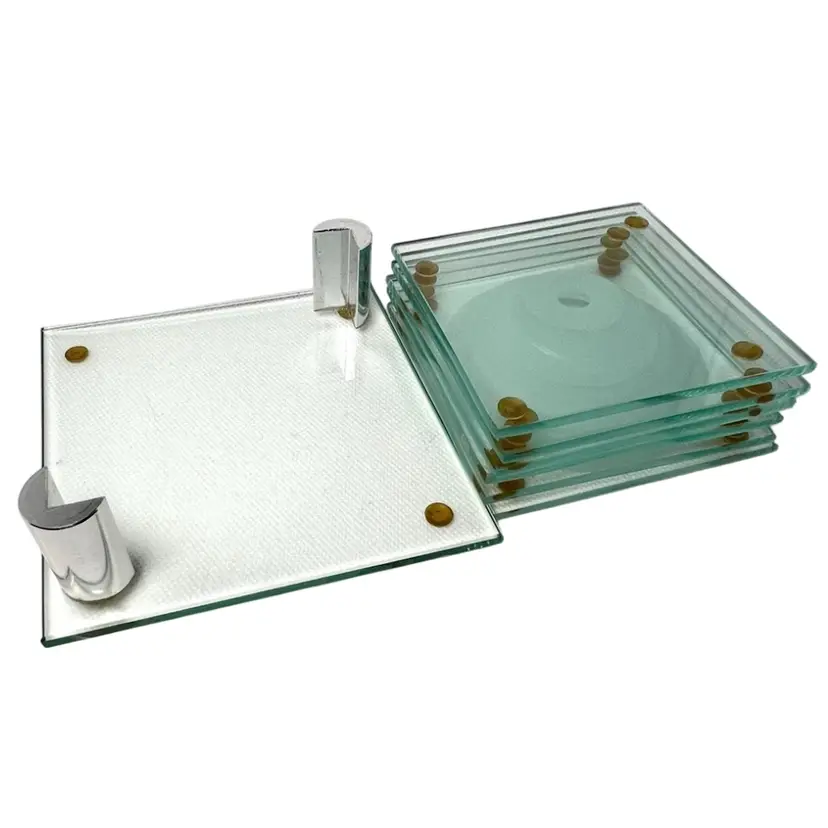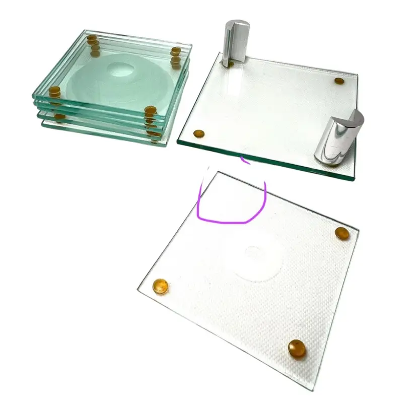 6 Stacked Glass Coasters Concentric Etched Rings Make A Bullseye Pattern. Fantastic greenish color. Glass Coaster Holder Base With Silver tone Pegs. Coasters 3-1/2” x 3-1/2” Base 4-1/2” x 4-1/2” Weighs 1-1/2 pounds Condition: No chips/cracks 1st coaster missing one corner rubber foot- see 2nd last photo with purple circle Very minor scratching Longest scratch on base- see last photo with purple circle