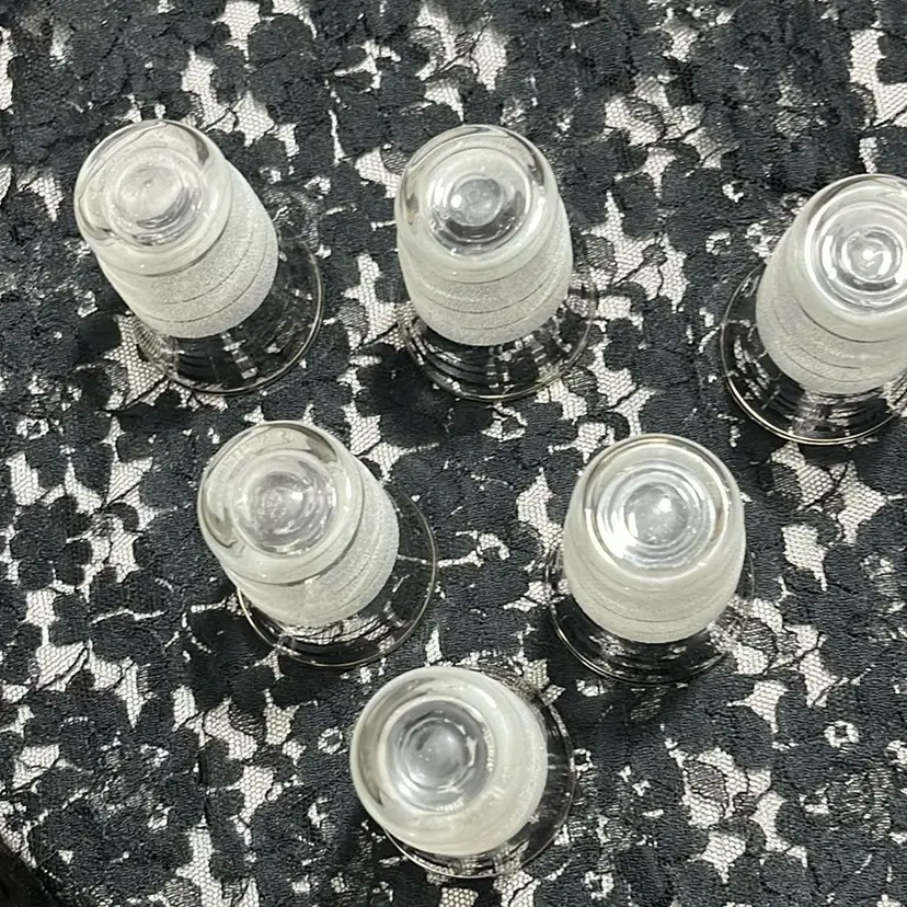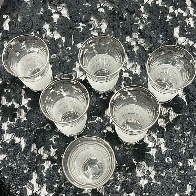 These glasses hold 2 ounces, stand 3.25” tall. The textured frost on the bottom half and clear tops with platinum rings make these 1950’s glasses perfect for your bar cart!
