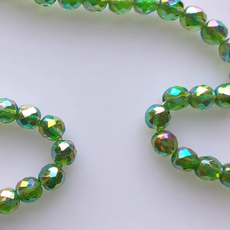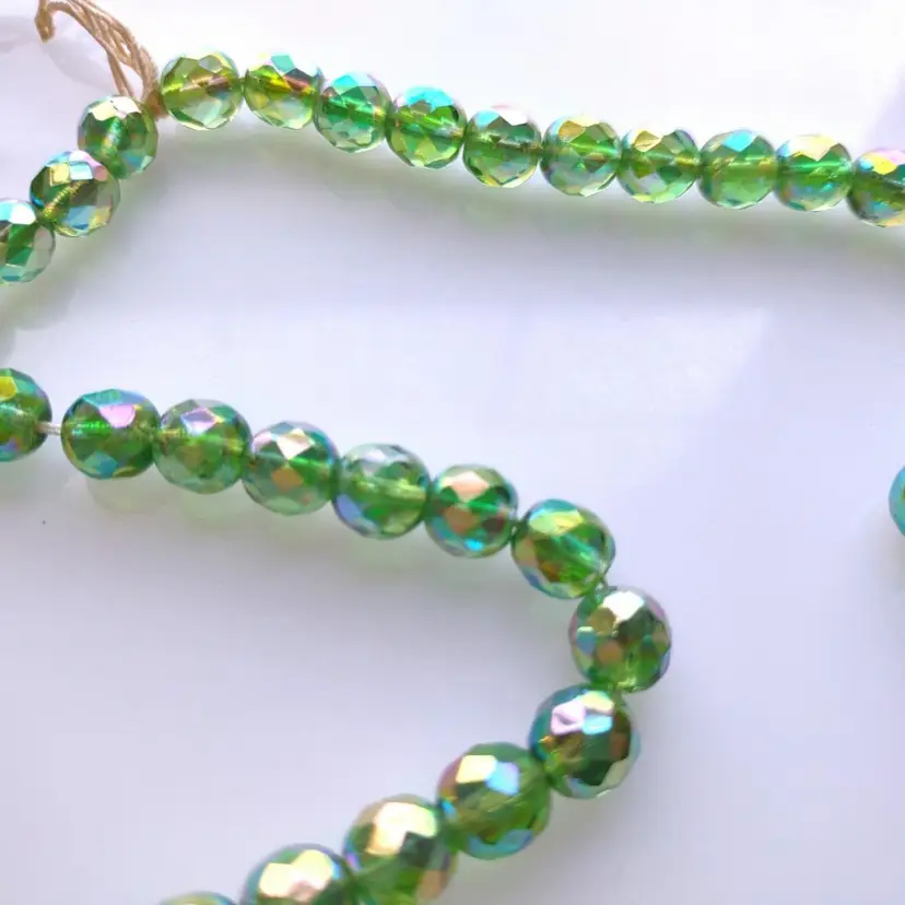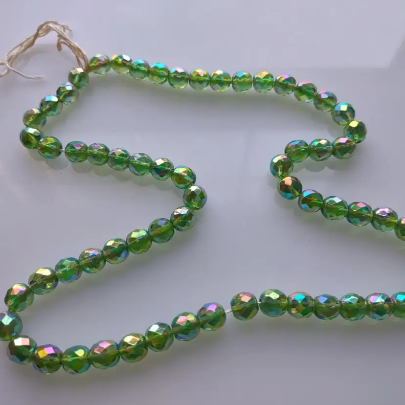 (60) Vintage 8mm green glass West German made beads Circa 1950s New old stock condition that come on temporary string. Has a tiny holes for stringing together. stock#60green2-9-2024-beads1
