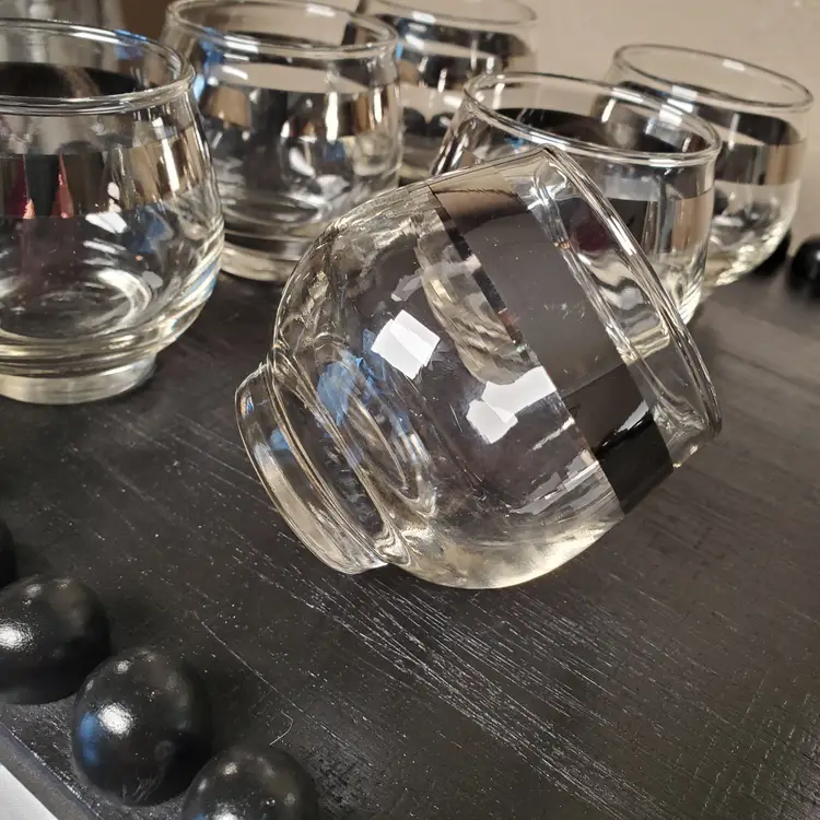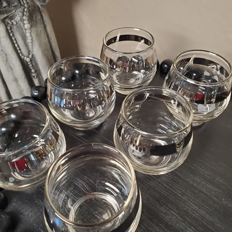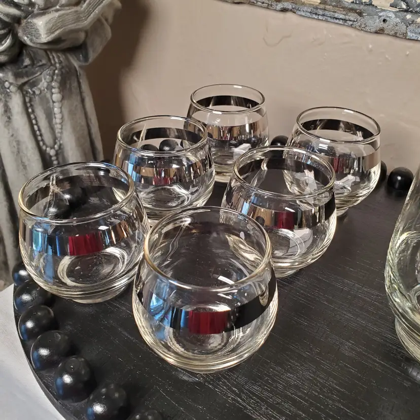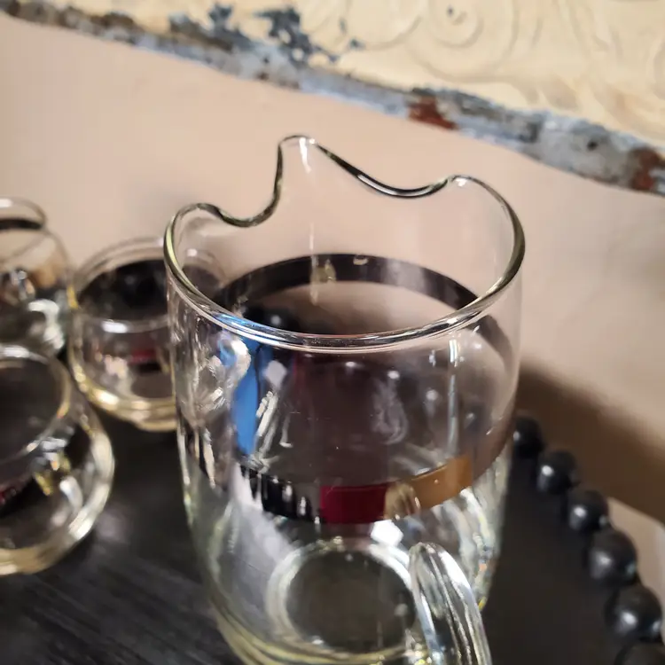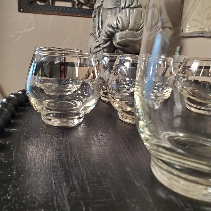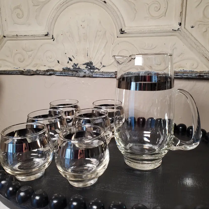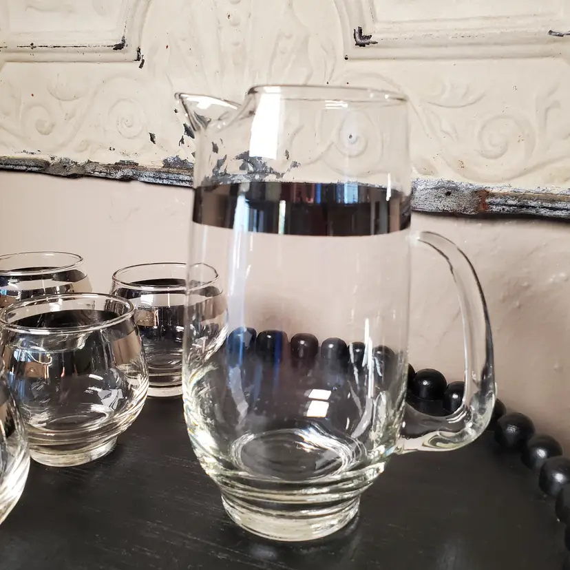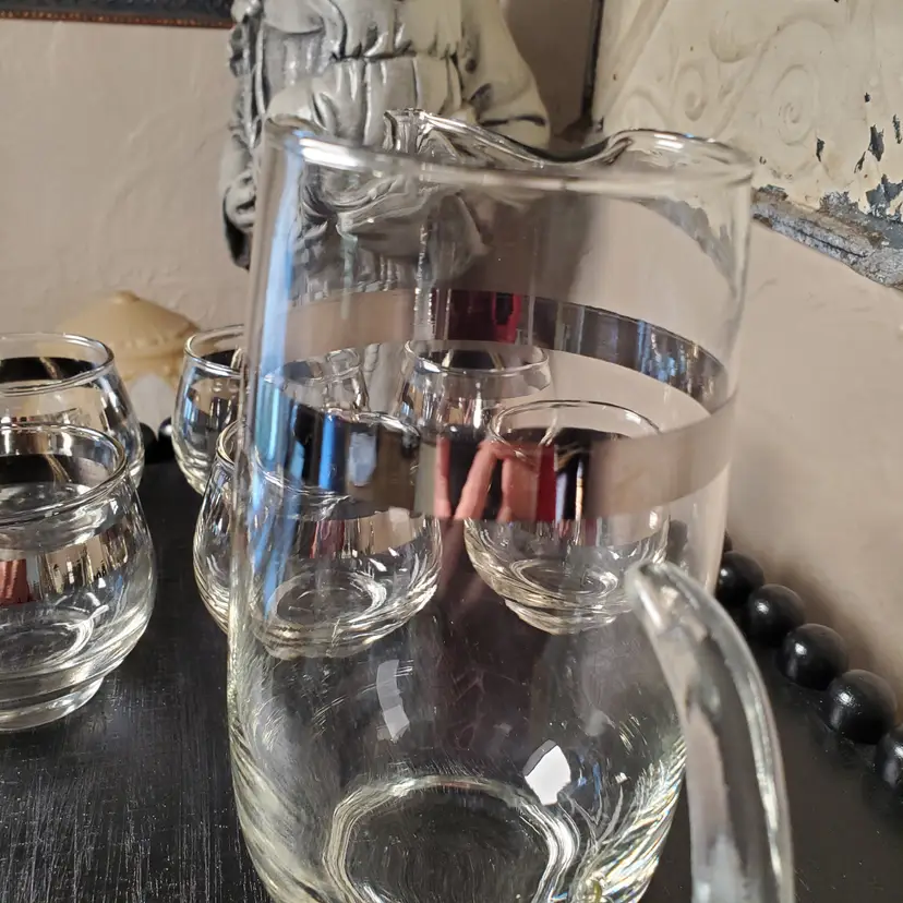 Set includes pitcher and six glasses. In excellent vintage condition. Pitcher: 6 1/4" x 3". Glasses: 2 1/2" x 2 1/4".