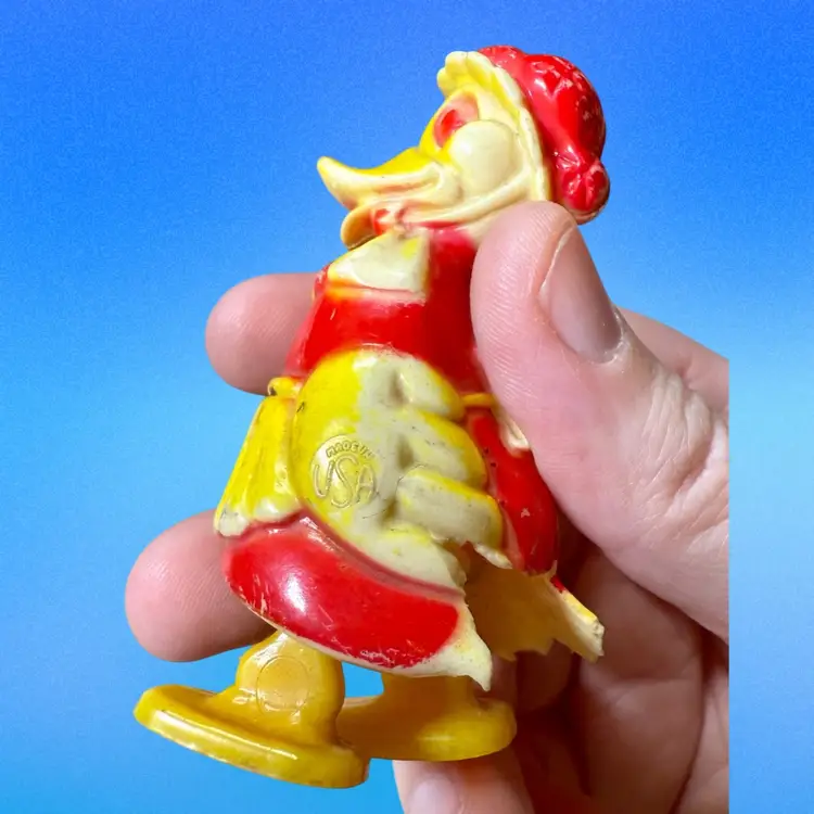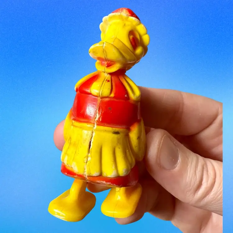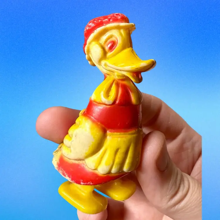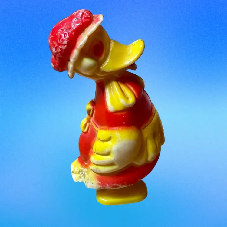 2.75” tall. Originally, she had baby ducks lined up behind her, but those have since been removed. There is also a chunk missing from her behind, probably when the babies were separated. Has paint wear from age. Stamped made in USA.