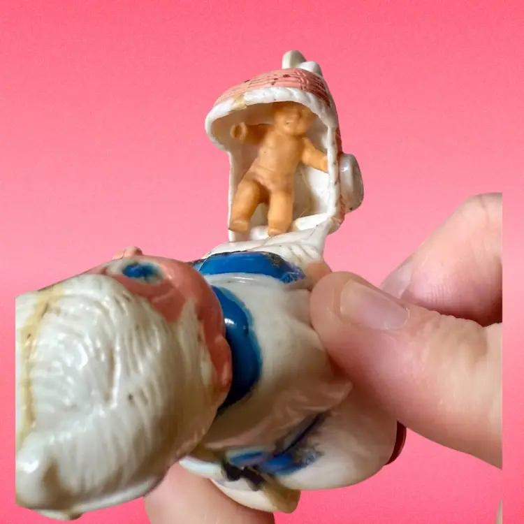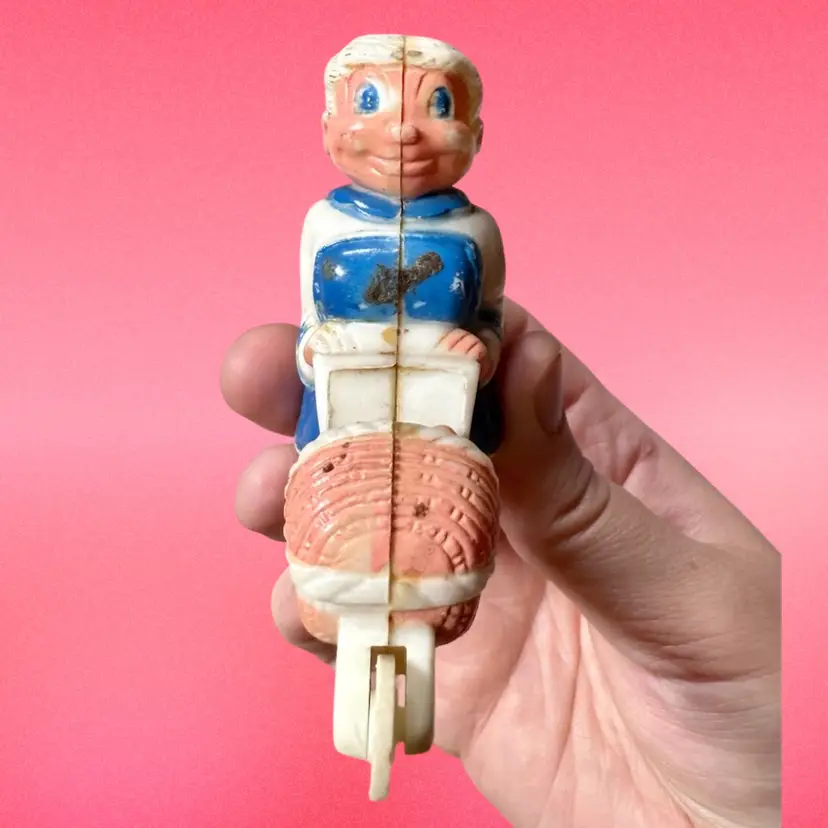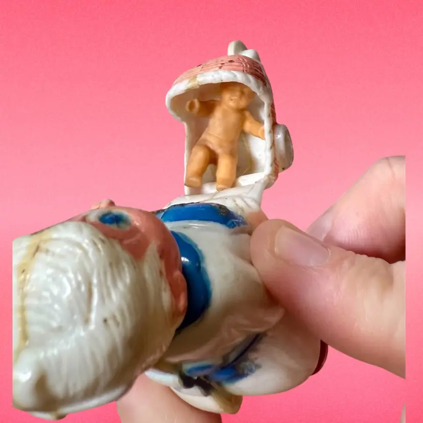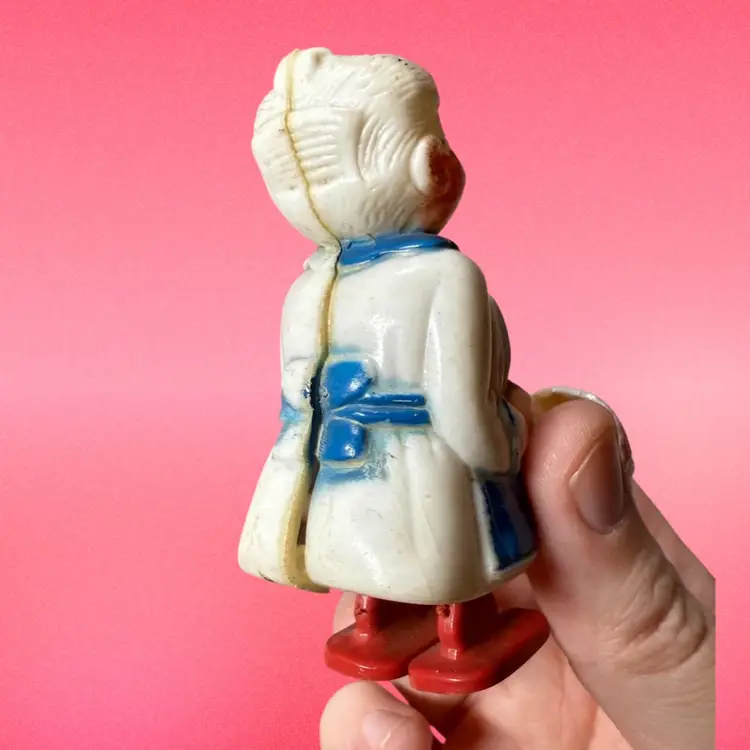 3.25”x3”. Nanny or grandmother pushing baby in stroller. There is a rubber baby lodged in the stroller, I’m not sure if it’s original or not. There is some paint wear, as well as something brown caked on the toy - I haven’t attempted any cleaning. The backside seam is slightly off kilter.