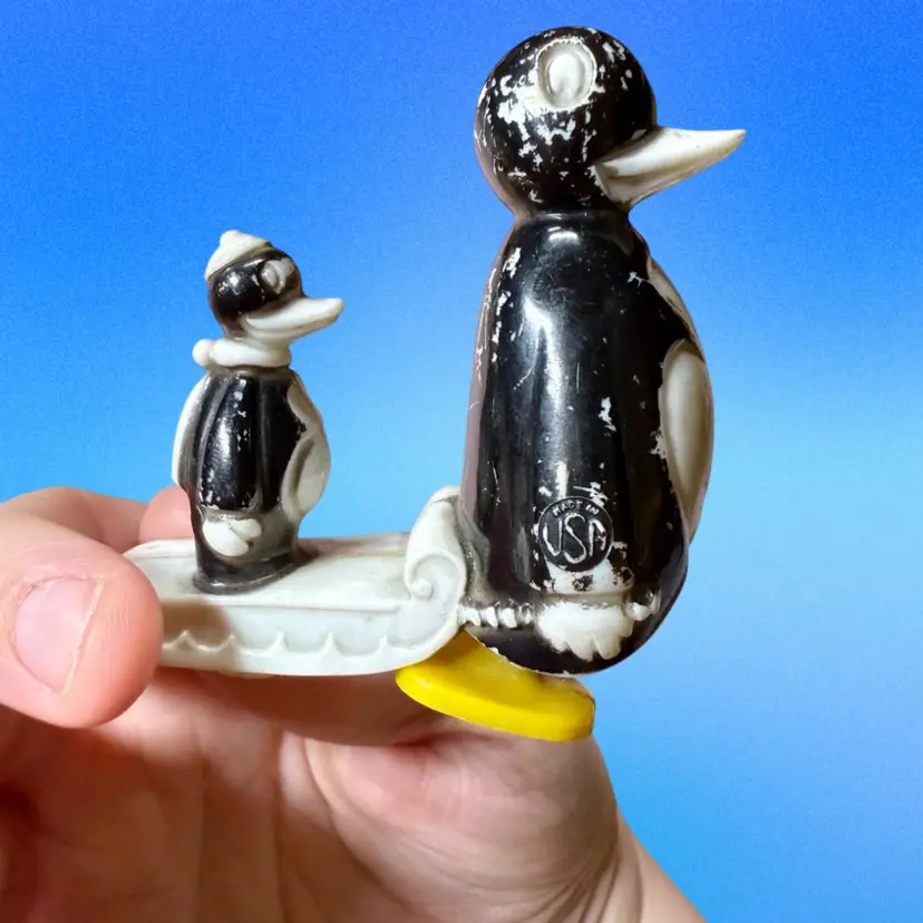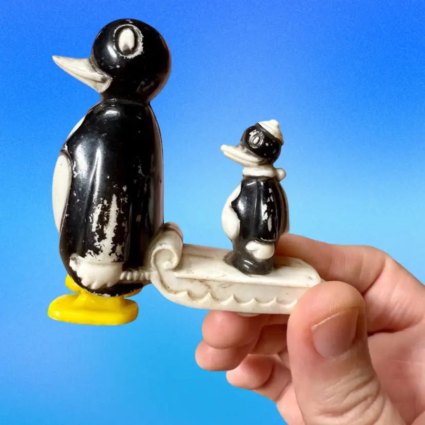 2.75”x2.75”. Toy walks on its own when going down a decline. Penguin pulling it’s baby on a sled. Paint wear throughout, but it adds to the charm! Stamped made in USA.