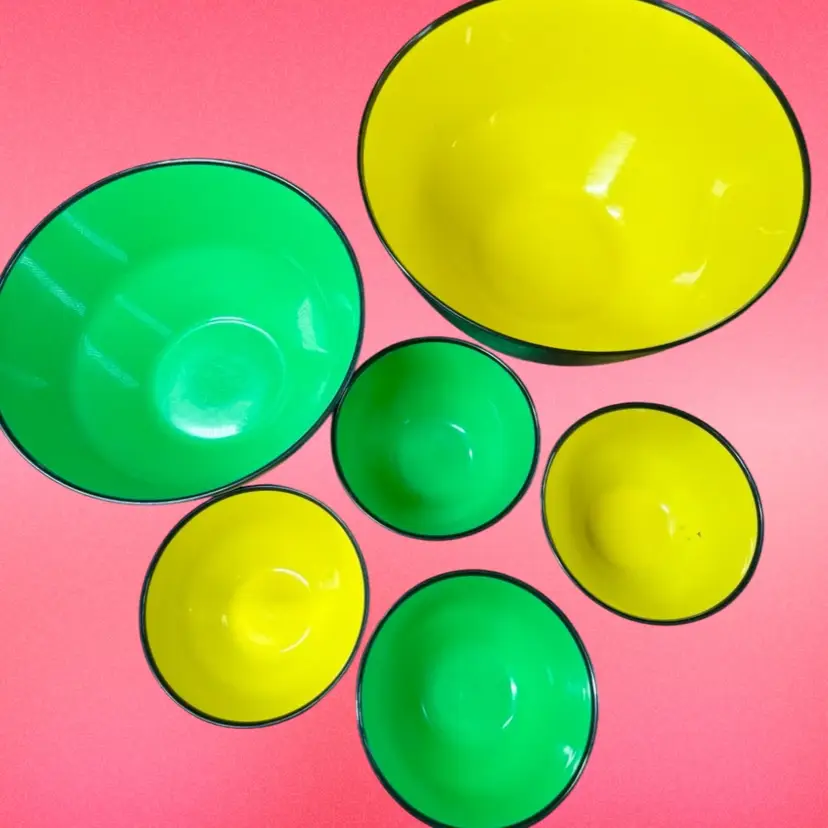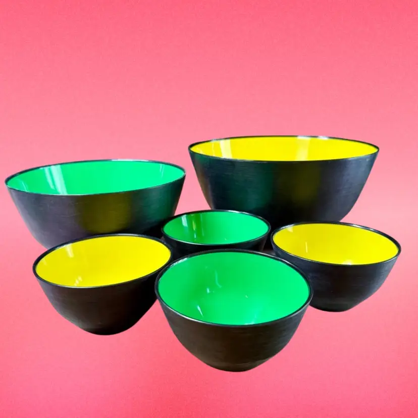 Large bowl (1 pc): 10.25”x6” Medium bowl (1 pc): 8.5”x5” Small bowls (4 pc): 5”x3” SIX piece melamine bowl set, 1960’s made in Sweden by Sigvard Bernadotte Husqvarna in bright green and yellow. ONE large, ONE medium, FOUR small. One small bowl has some dark marks on the inside, was maybe once used as an ashtray. Good used vintage condition overall.
