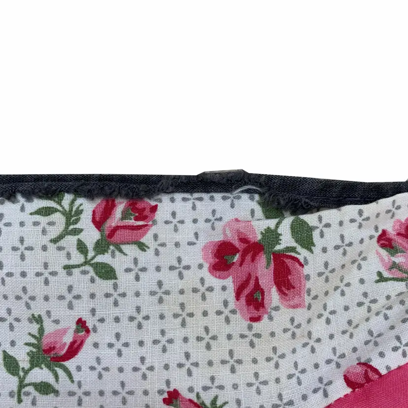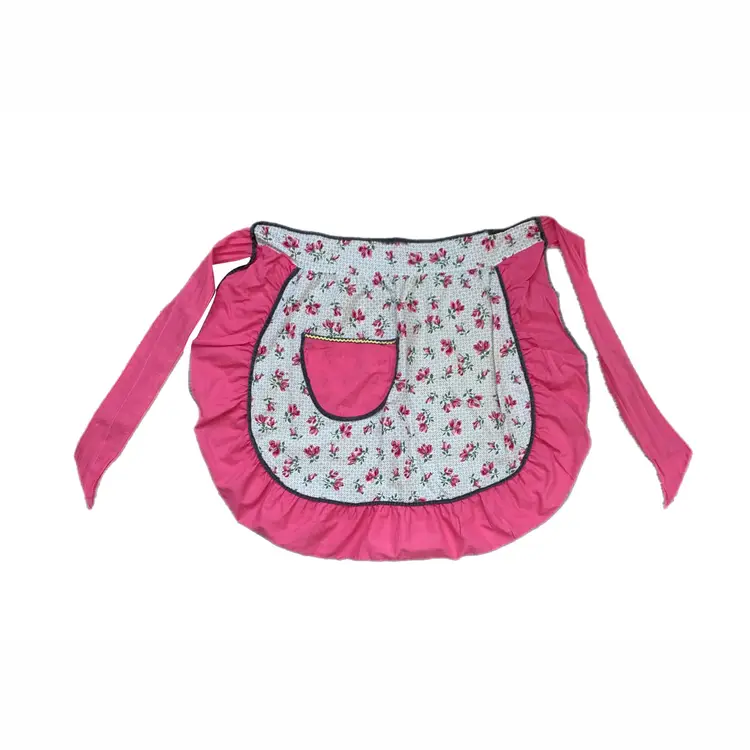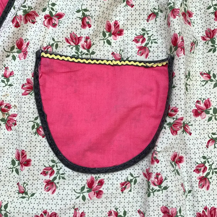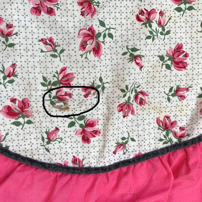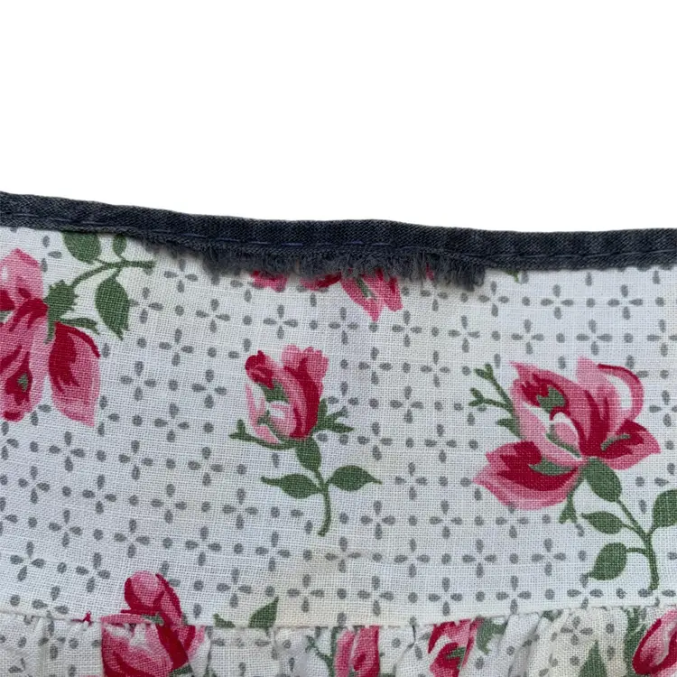 A few stains and some fraying due to age, measures approx. 18” long, waist band 17”, ties 17” each, made of cotton.