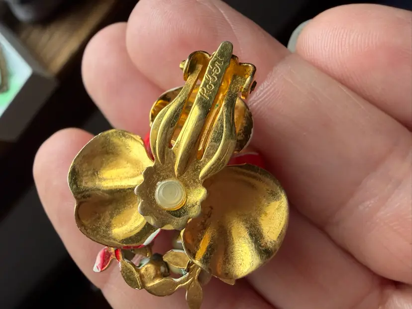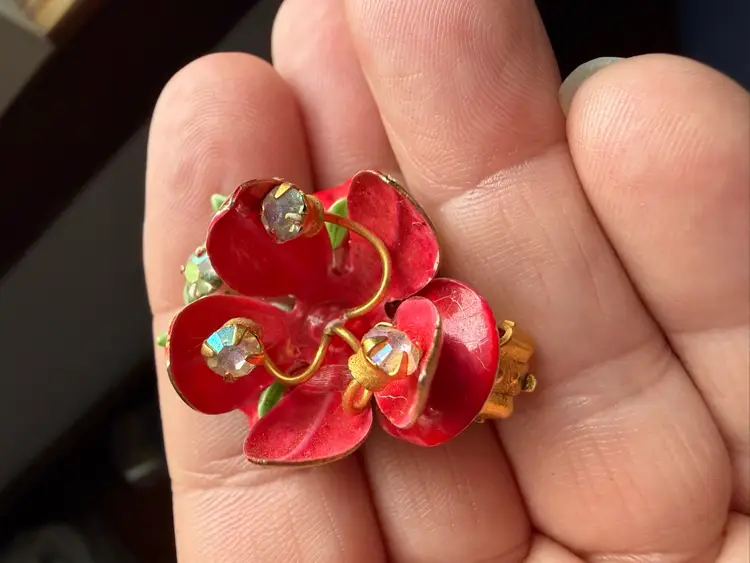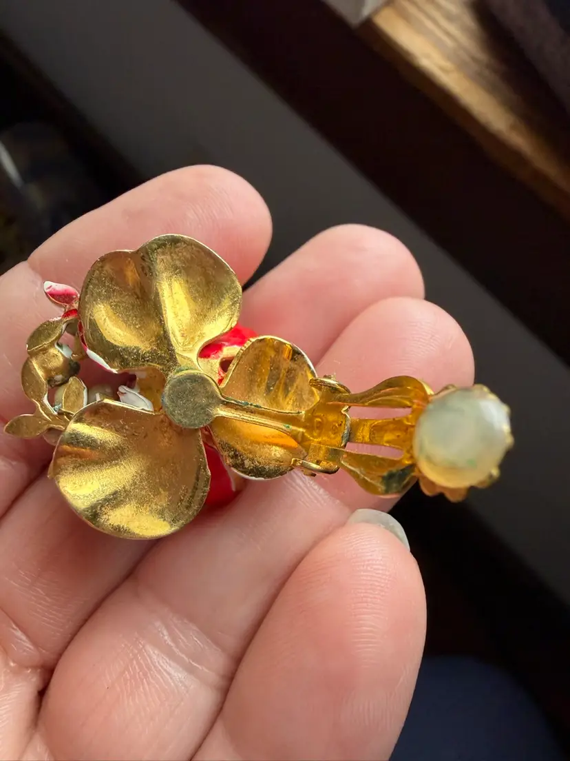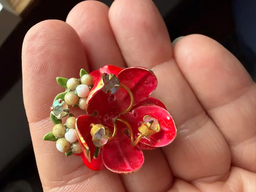 Red enamel floral earrings. They are gold town with aurora borealis rhinestone pistils in the center. There are white floral clusters at the top of the earring with another aurora borealis rhinestone and greenery.