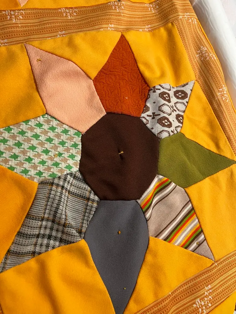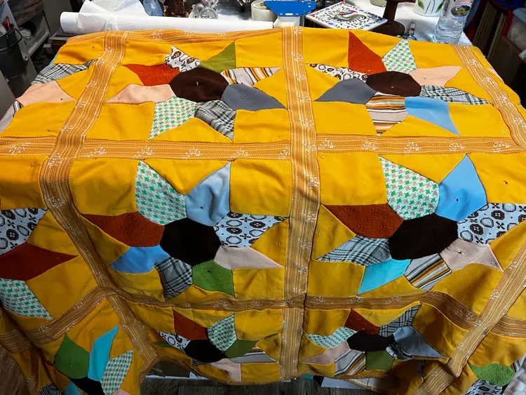 #617A Large Vintage Yellow And Multicolored Star Pattern Double Knit Polyester Handmade Blanket With Backing And Ties Instead Of Being Quilted. As Shown Live