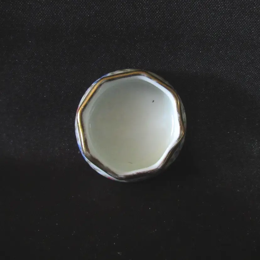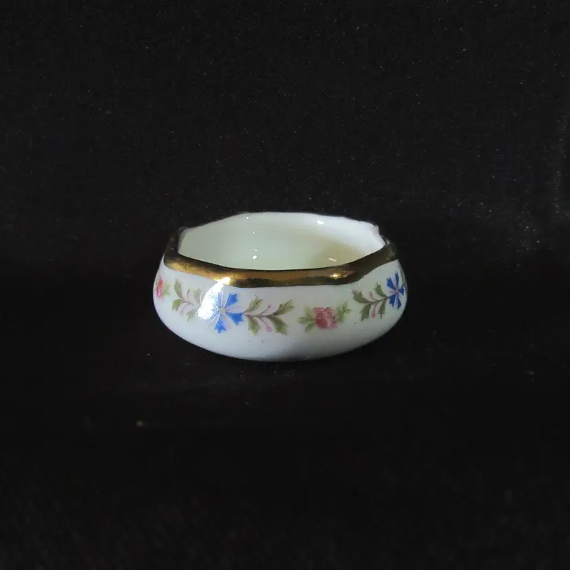 VTG Small Porcelain Open Salt Cellar w/ Flowers White w/ gold trim. Flowers ring the outside rim. No markings Approx. 1/2" tall x 1 3/8" across the top Excellent condition with no chips, cracks or breaks