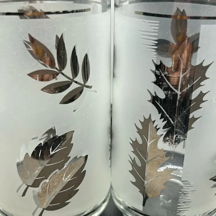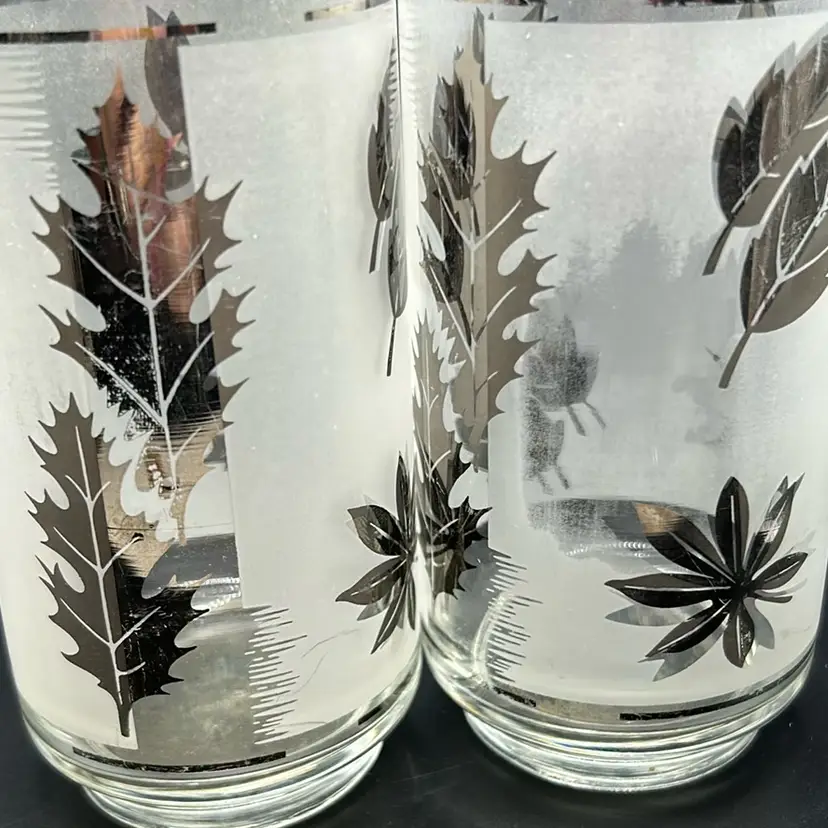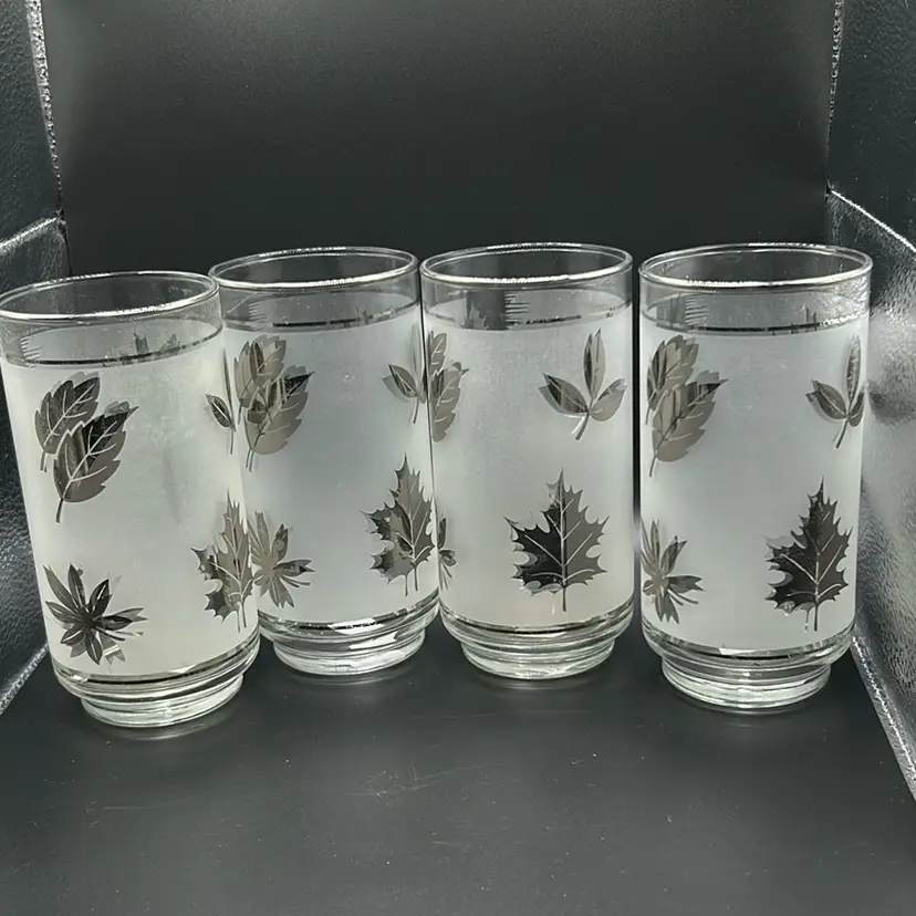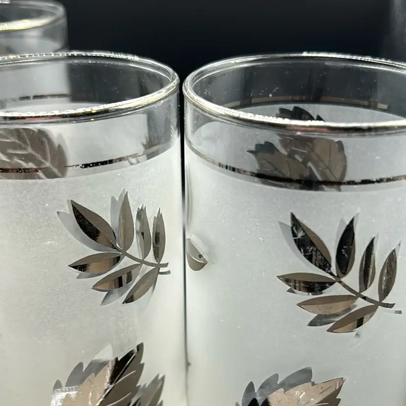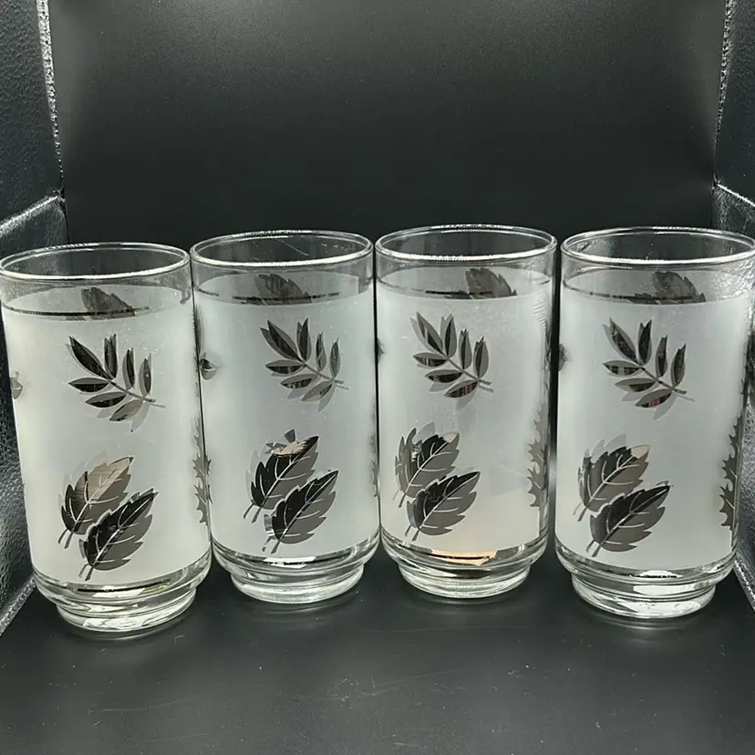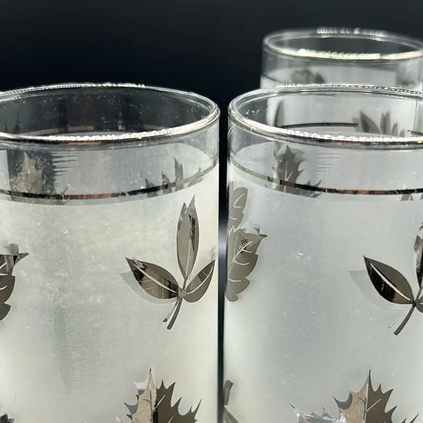 Nice set of 4 tumblers. There is some silver wear which I tried to show in pictures. They have a volume of 16 ounces. Measures almost 6 inches tall and 3 inches wide. There are no chips or cracks.