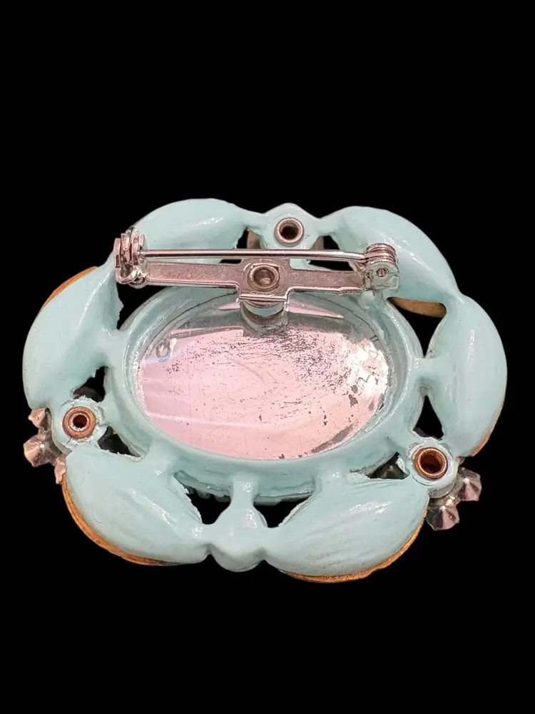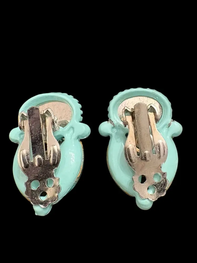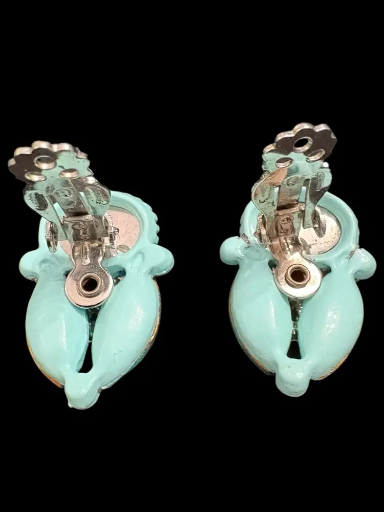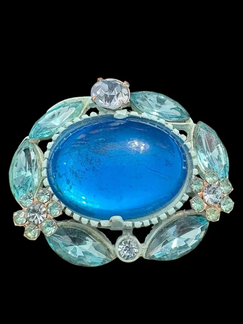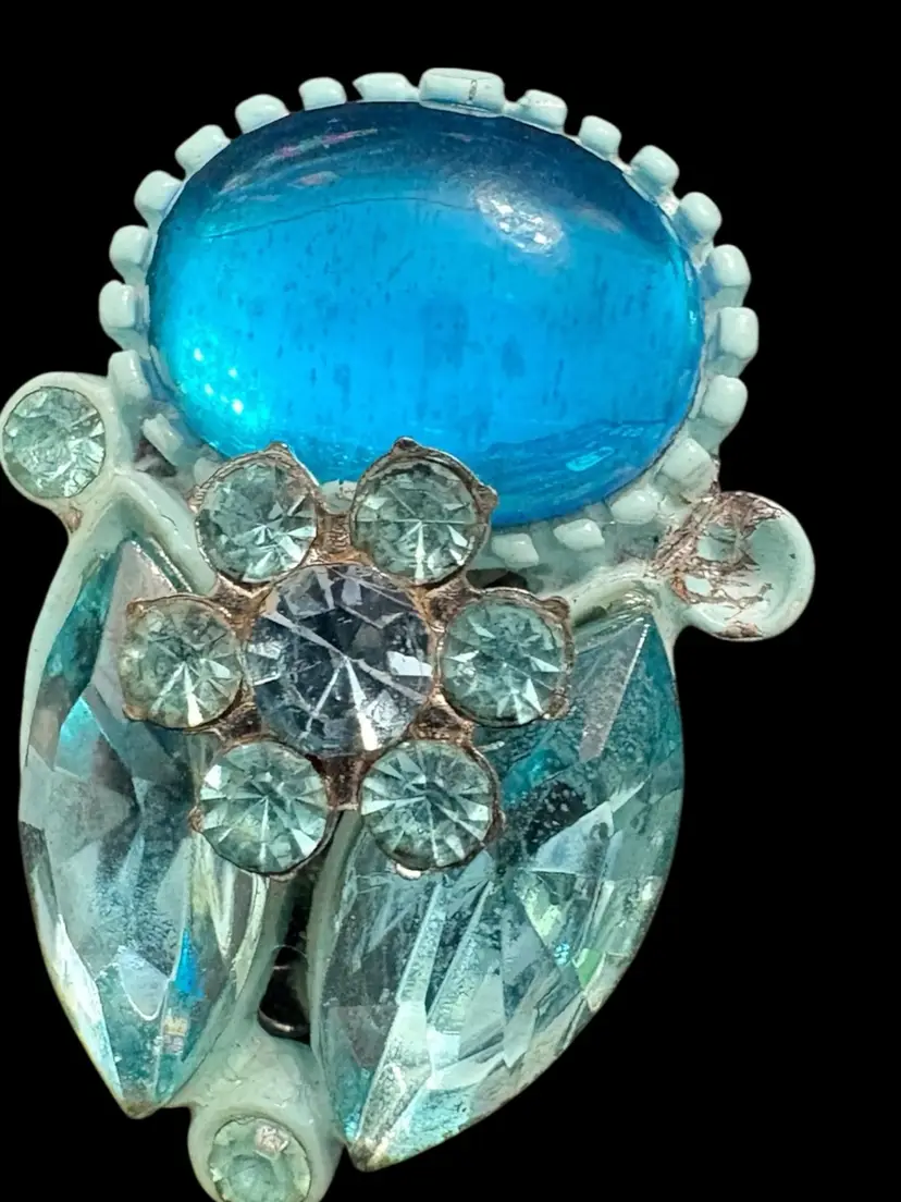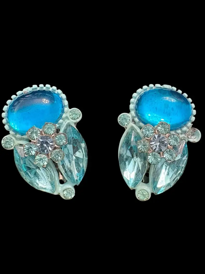 One small blue rhinestone missing on clip on earring, see last photo. Appropriate vintage wear to set.