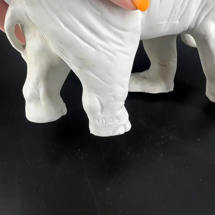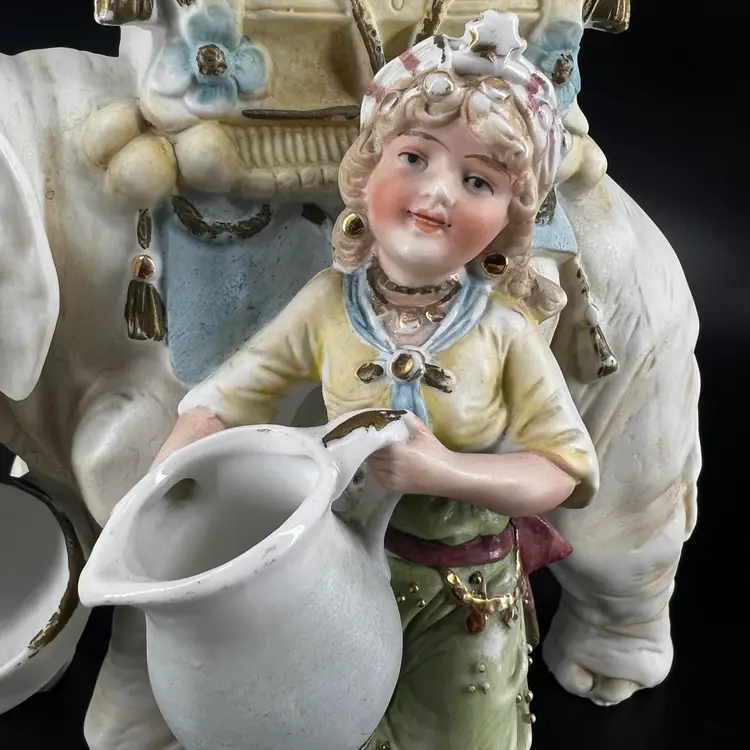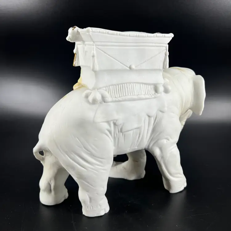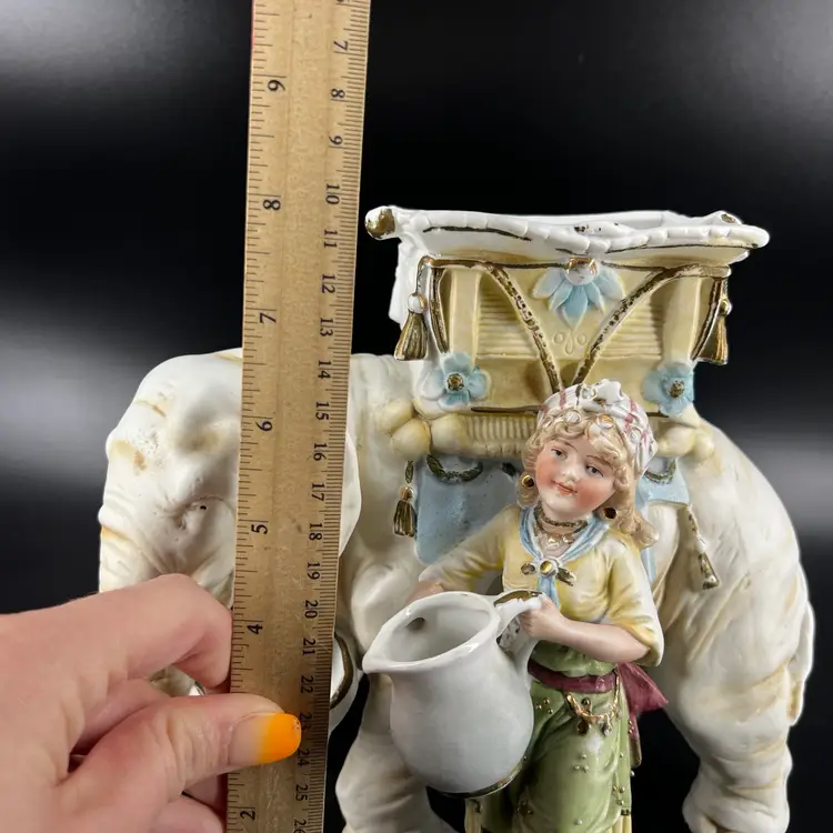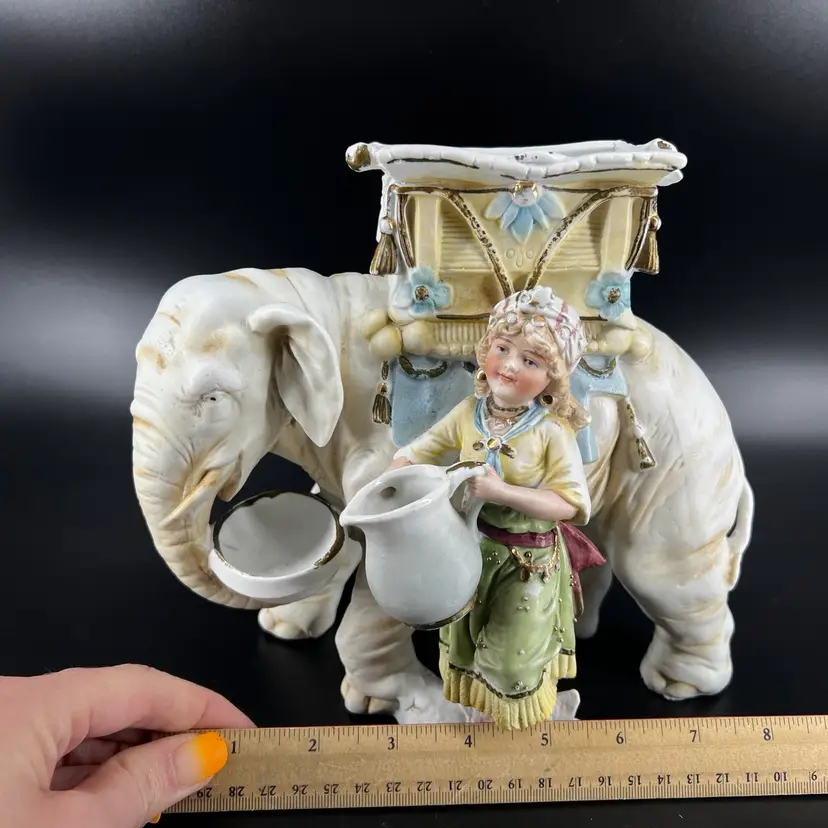This elephant with boy is made in Germany. It is made from a bisque porcelain and attributed to Carl Schneider. Originally, it would have come in a set of two. It measures approx 8” tall and 8” wide. There are no chips or cracks.
