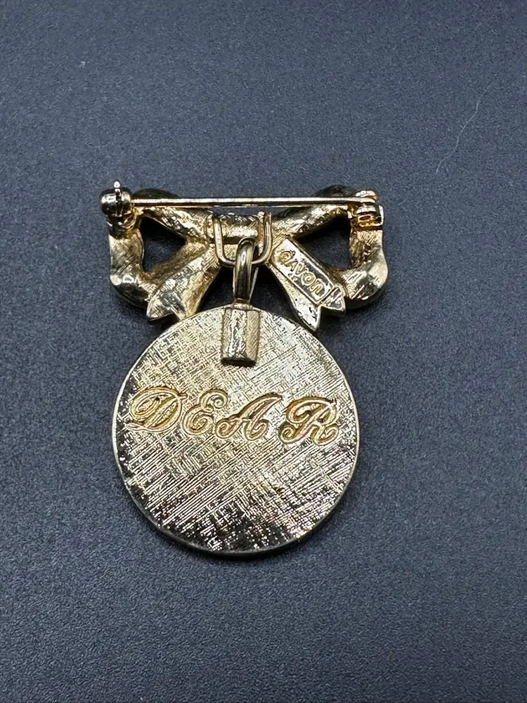 69 - Avon Bow Dangle Rhinestone Engraved Dear Brooch