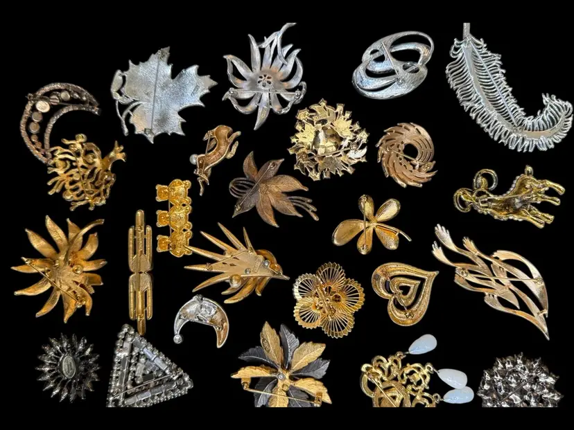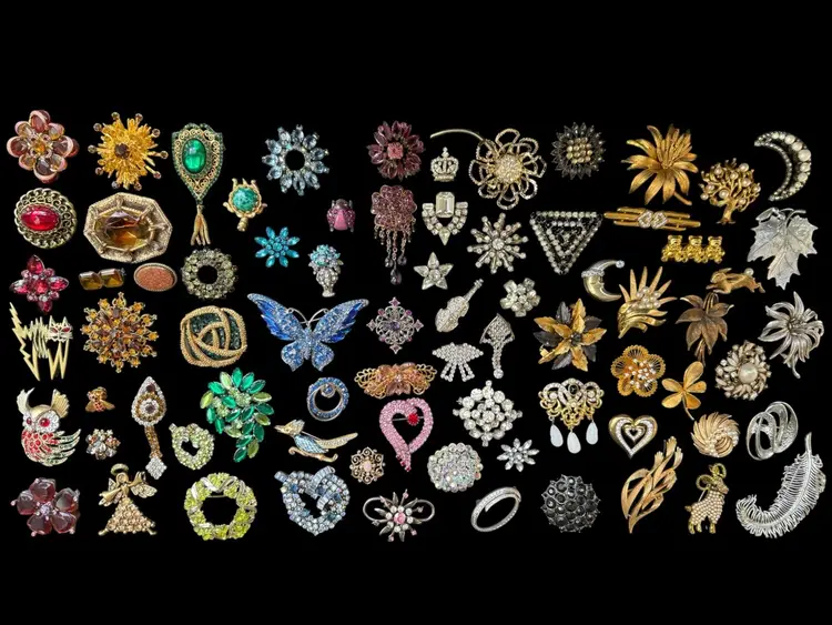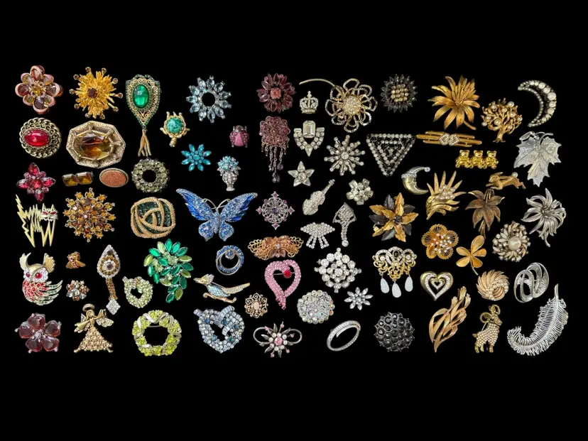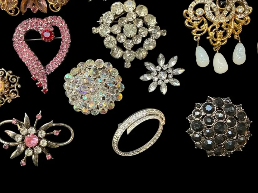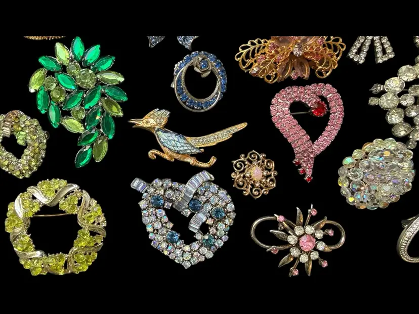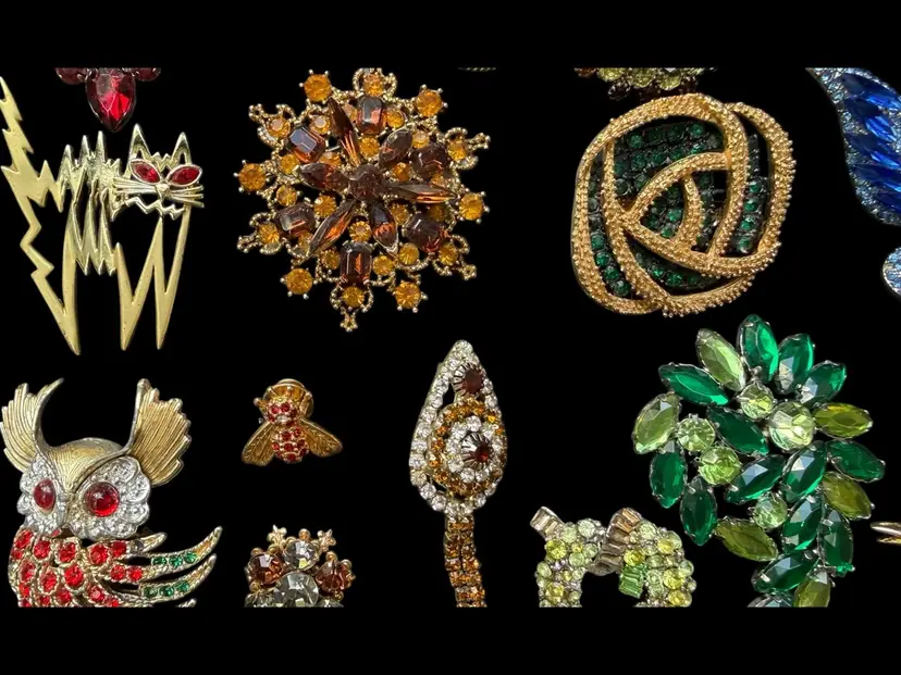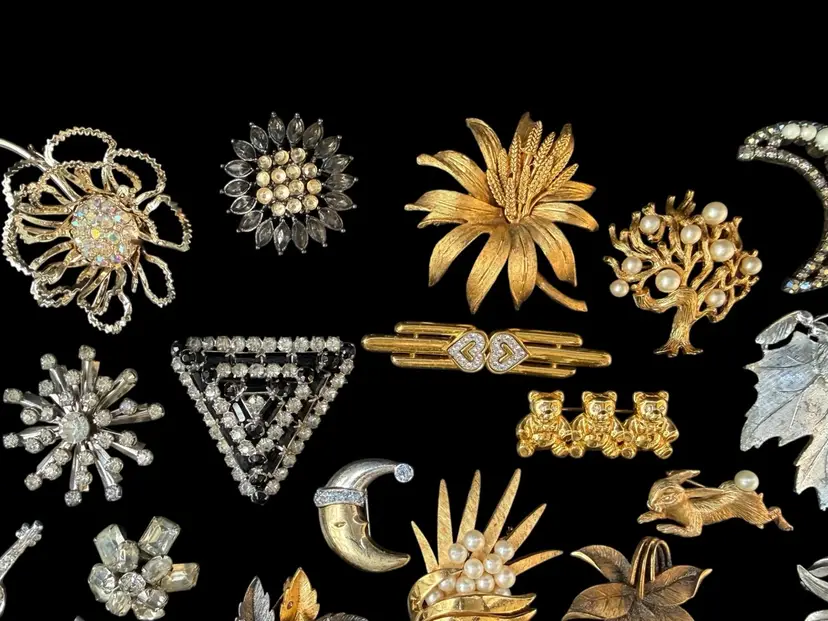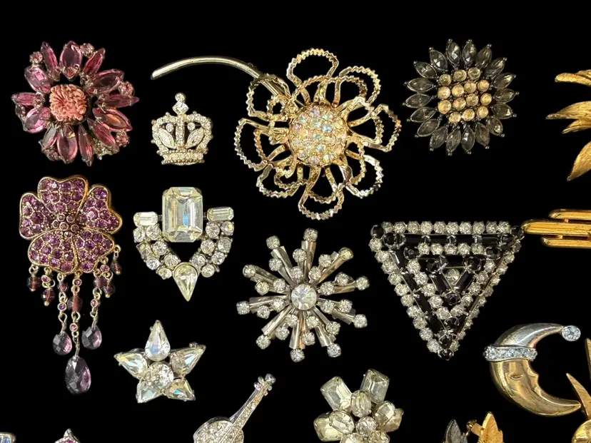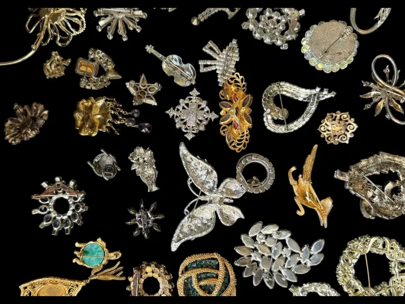 Beautiful mix of rhinestone florals, figural pieces, gold tone, silver tone, statement, novelty, and classic styles.