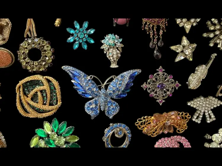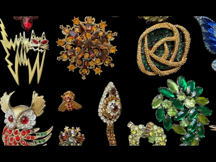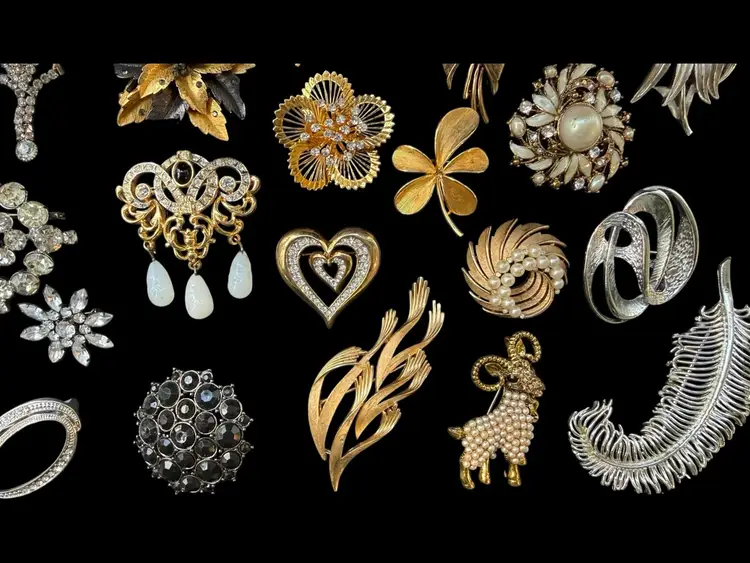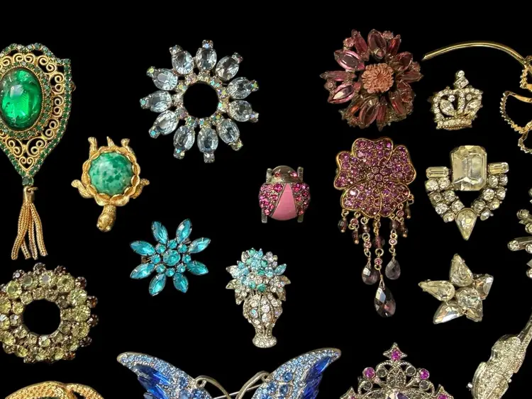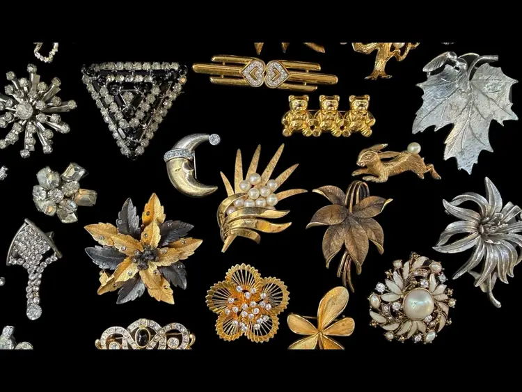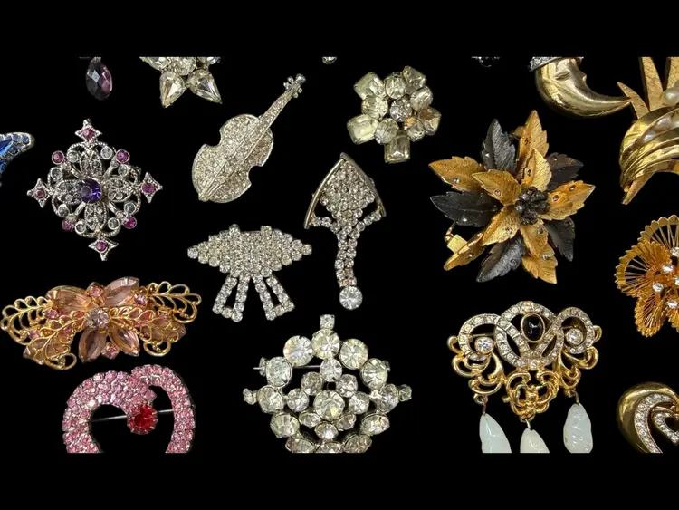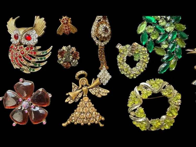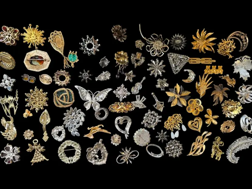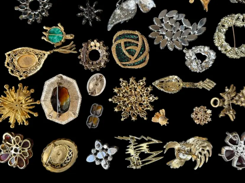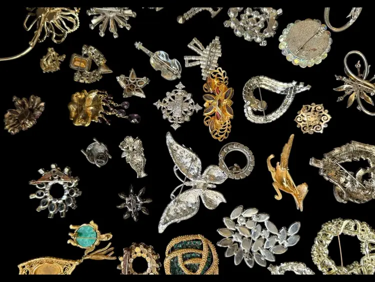 Beautiful mix of rhinestone florals, figural pieces, gold tone, silver tone, statement, novelty, and classic styles.
