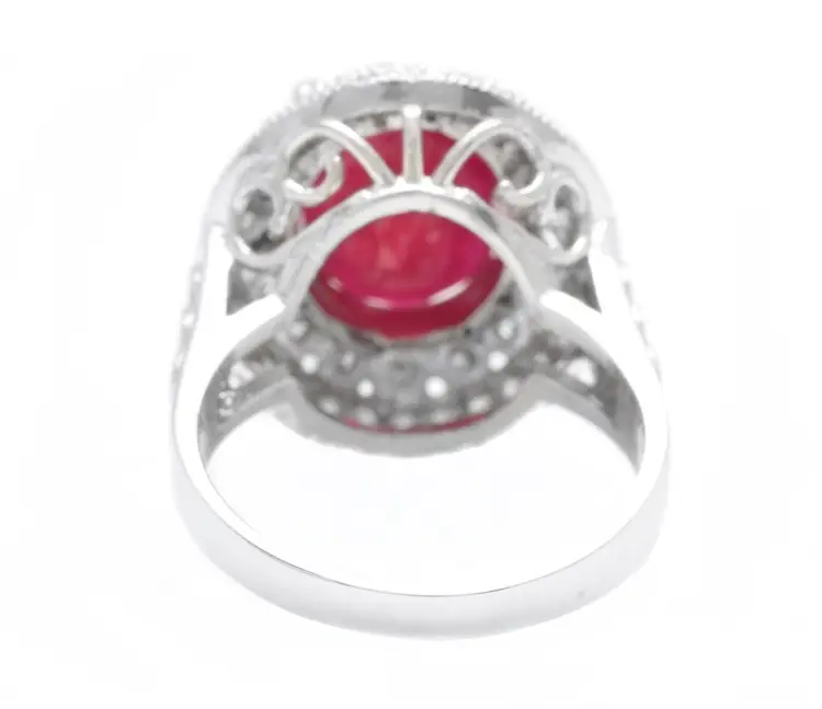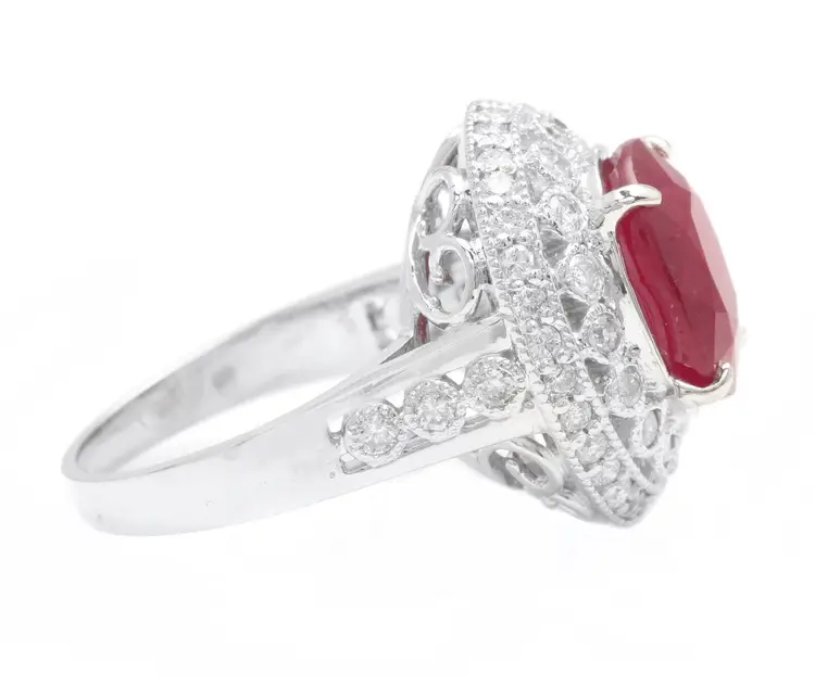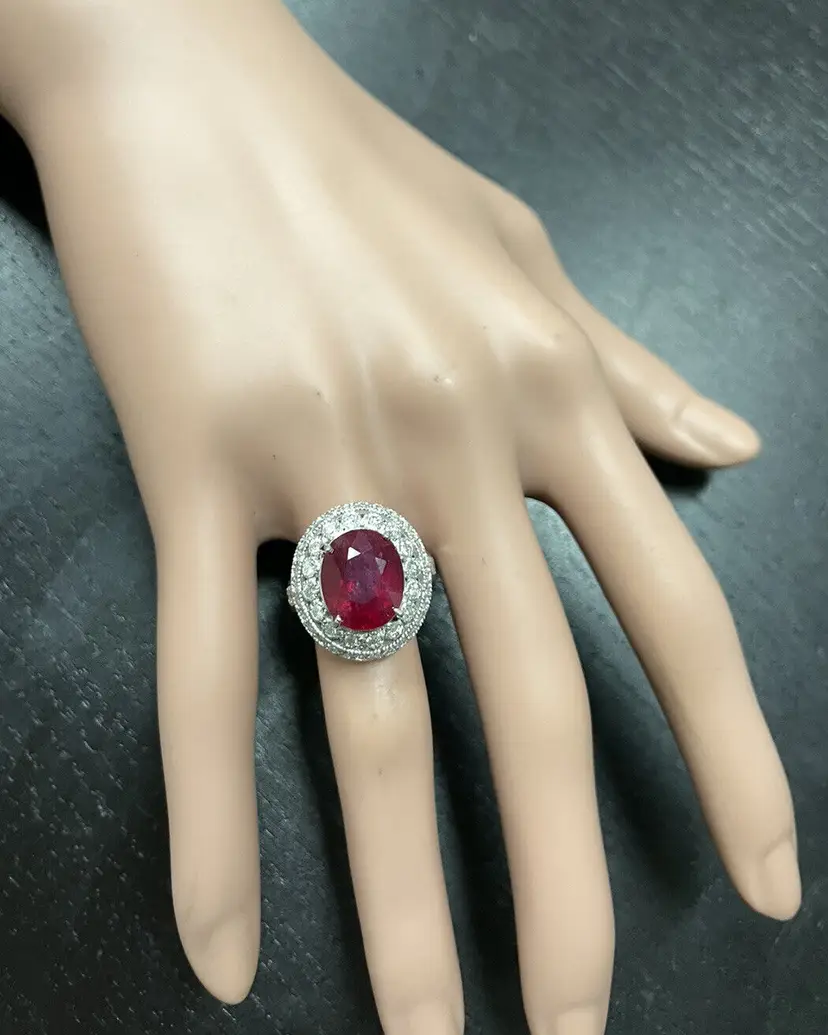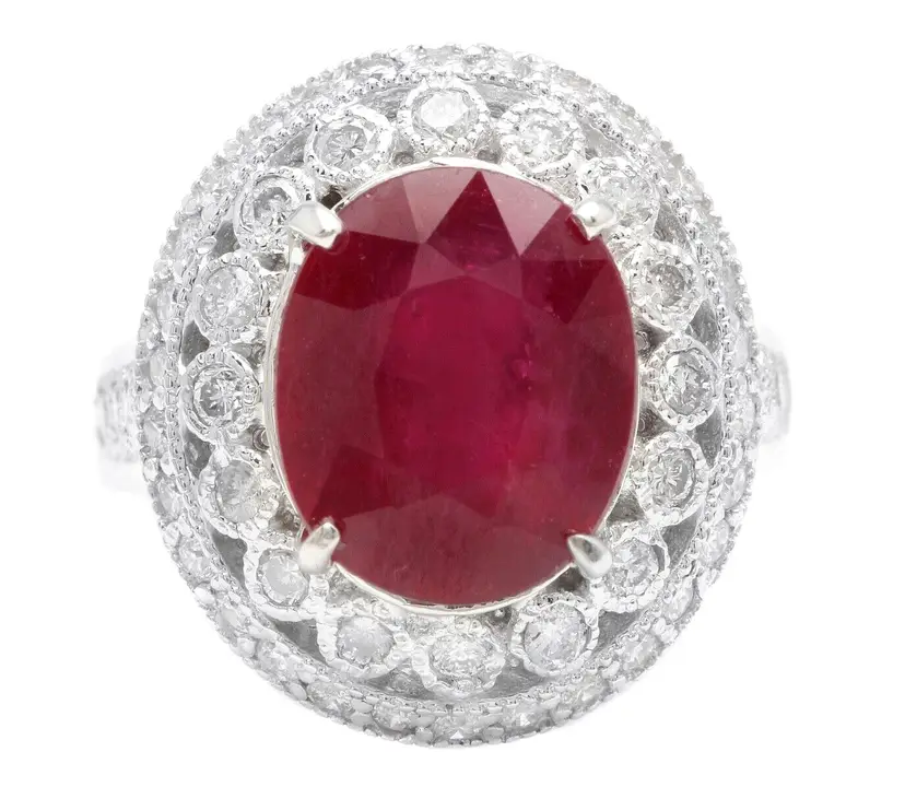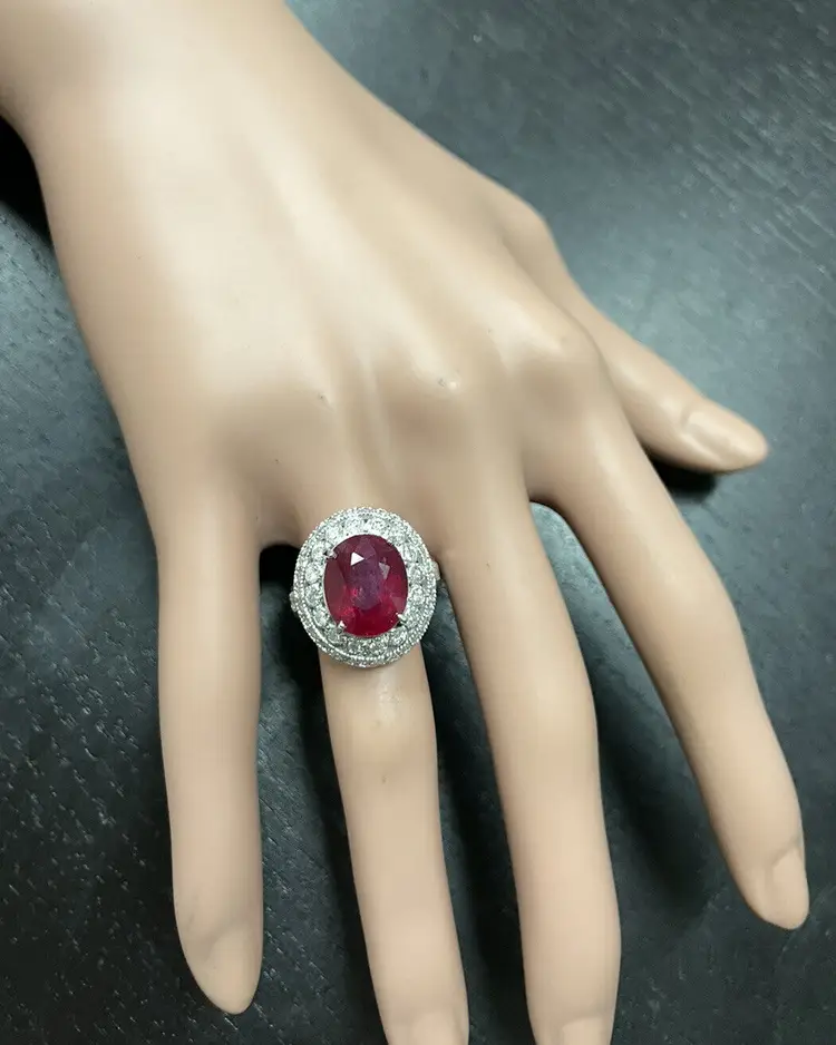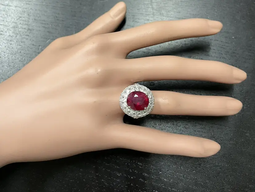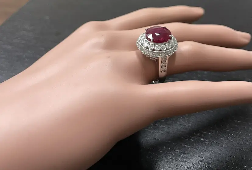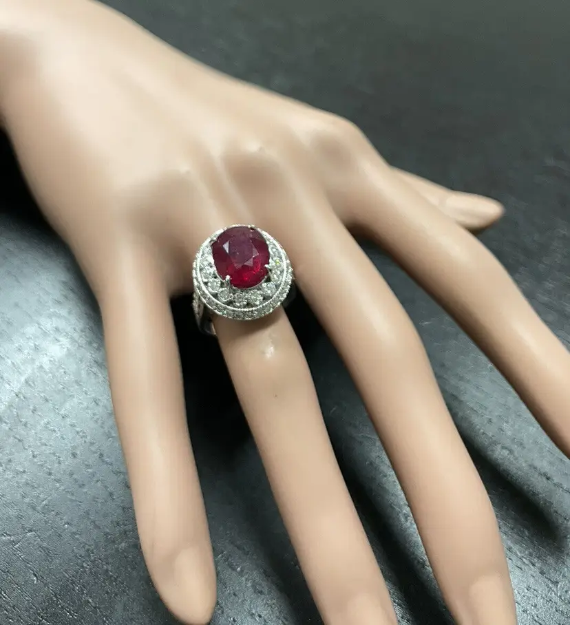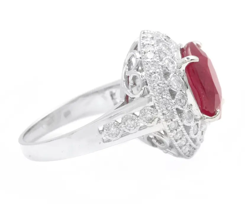 Main Stone Creation: Natural Sizable: Yes Main Stone Color: Red Metal: White Gold Secondary Stone: Diamond Main Stone: Ruby Brand: Unbranded Ring Size: 7 Main Stone Treatment: Lead Glass Filled Type: Ring Metal Purity: 14k solid gold Main Stone Shape: Oval Gemstone Clarity Grade: Moderately Included Total Carat Weight (TCW): 7.10
