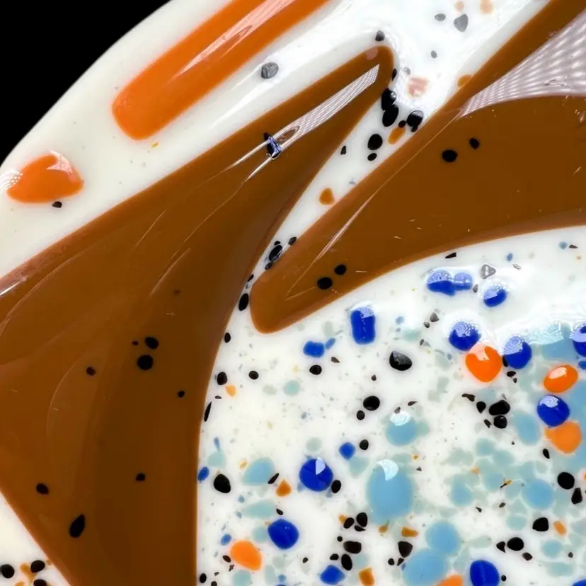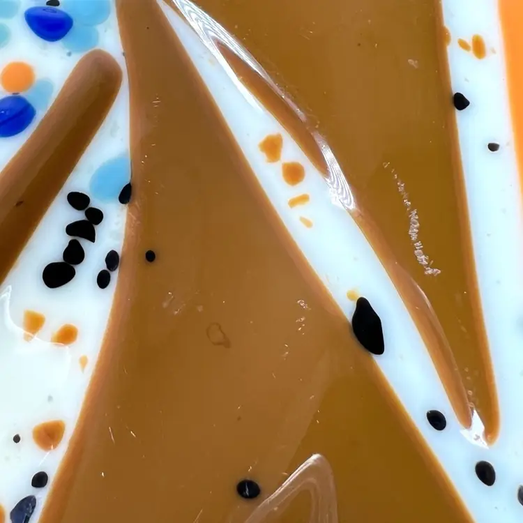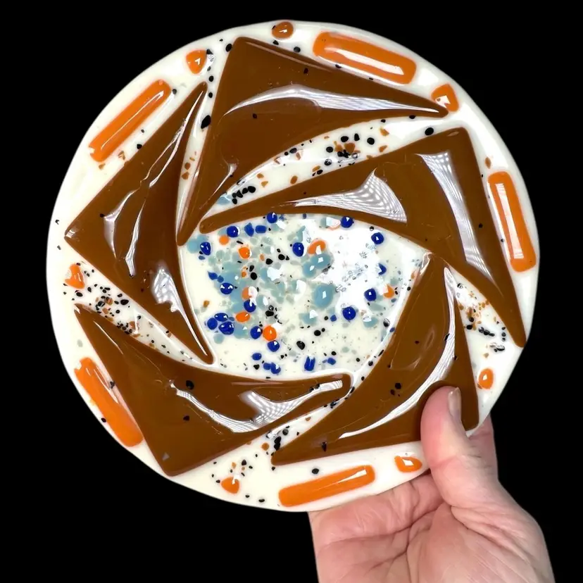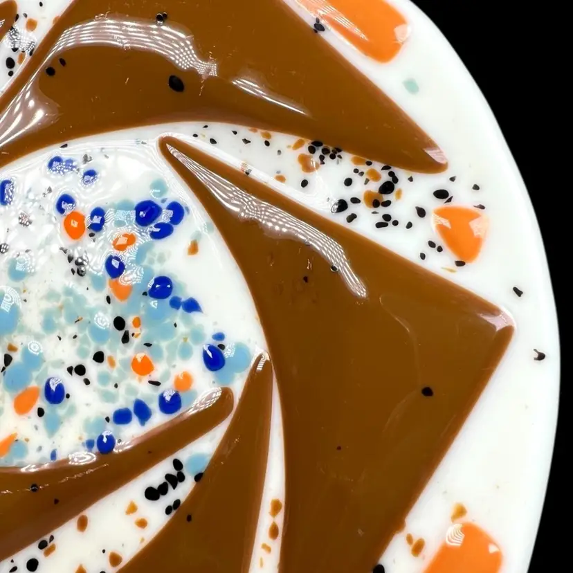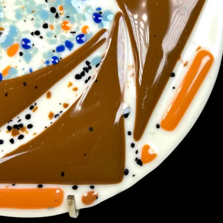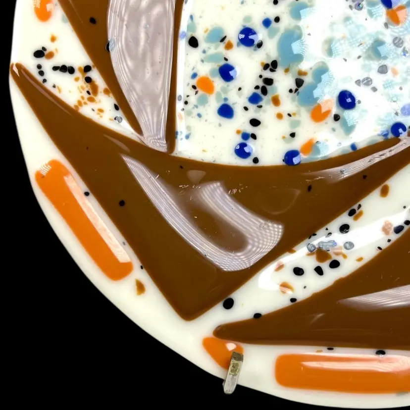 Fused Glass Decorative Plate Brown, Orange, & Blues Pieces On White 7-3/4” Diameter x 1/2” Height Great For Candle Holder ! Weighs 13 ounces Condition: No chips or cracks. The raised brown areas do have some scratches, as shown closeup in last 4 photos.