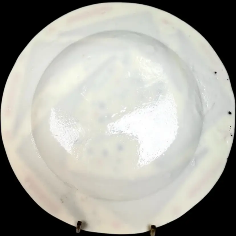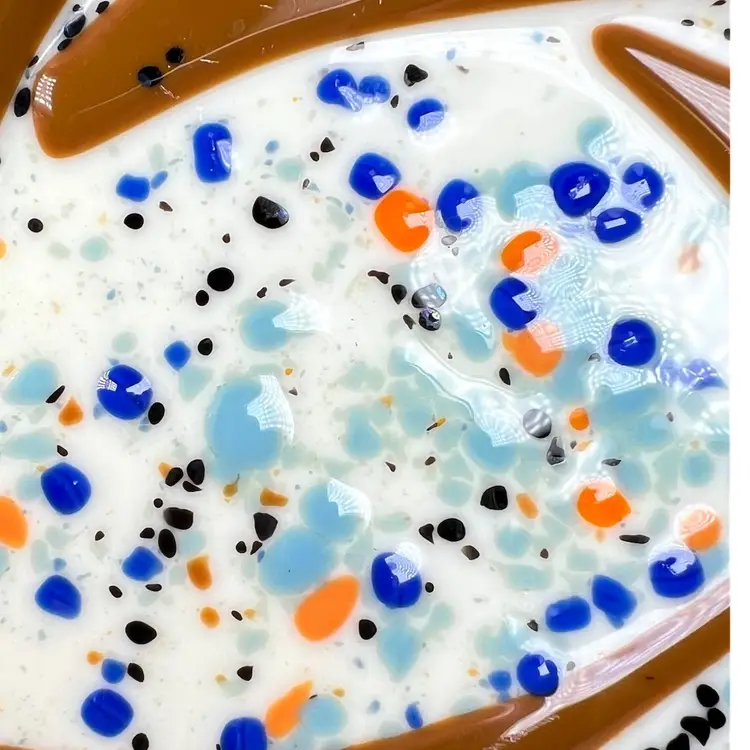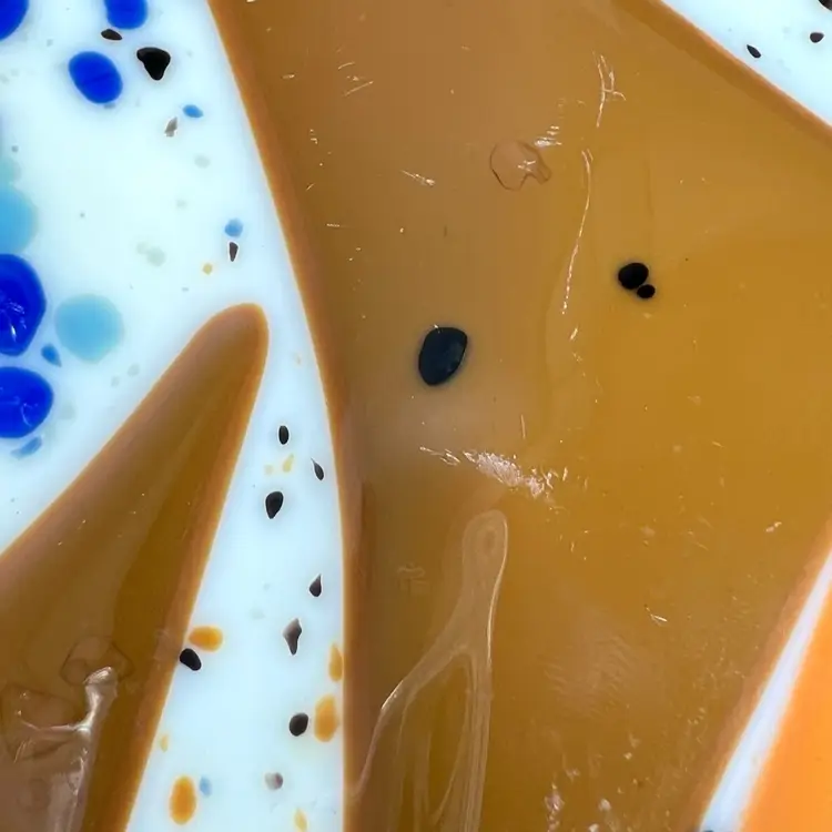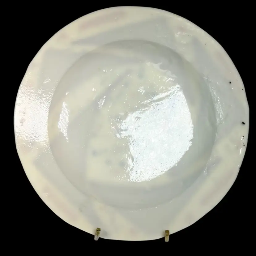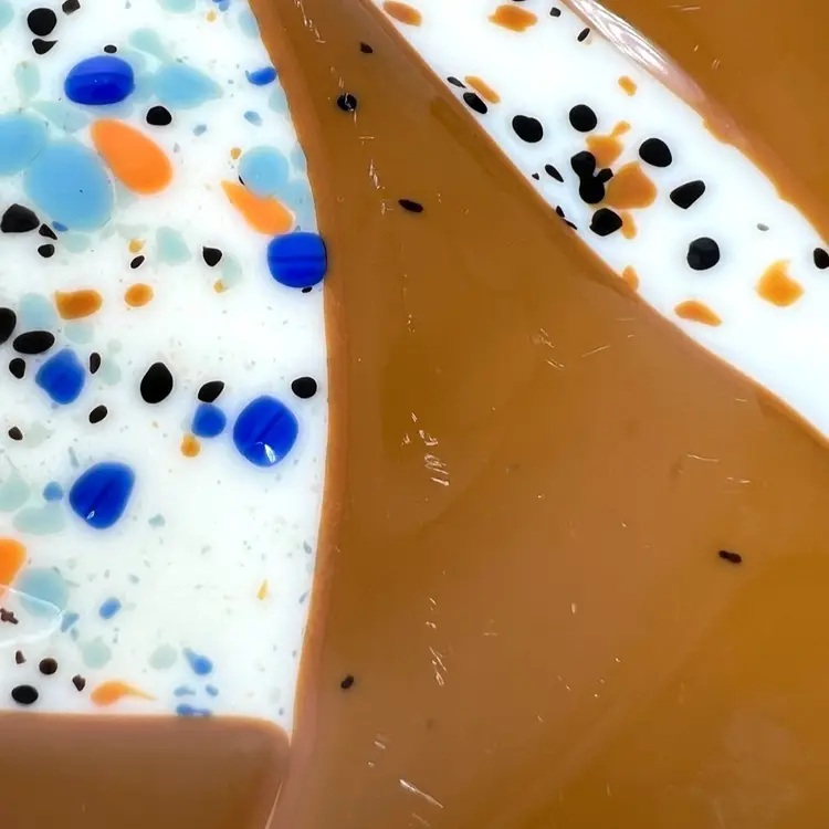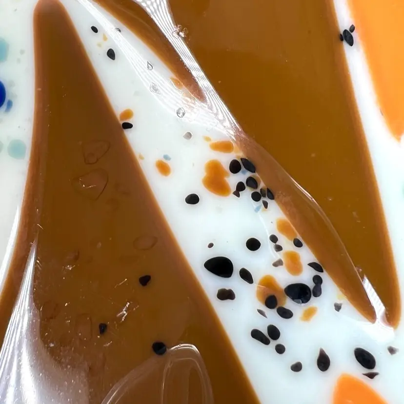 Fused Glass Decorative Plate Brown, Orange, & Blues Pieces On White 7-3/4” Diameter x 1/2” Height Great For Candle Holder ! Weighs 13 ounces Condition: No chips or cracks. The raised brown areas do have some scratches, as shown closeup in last 4 photos.