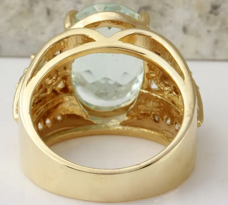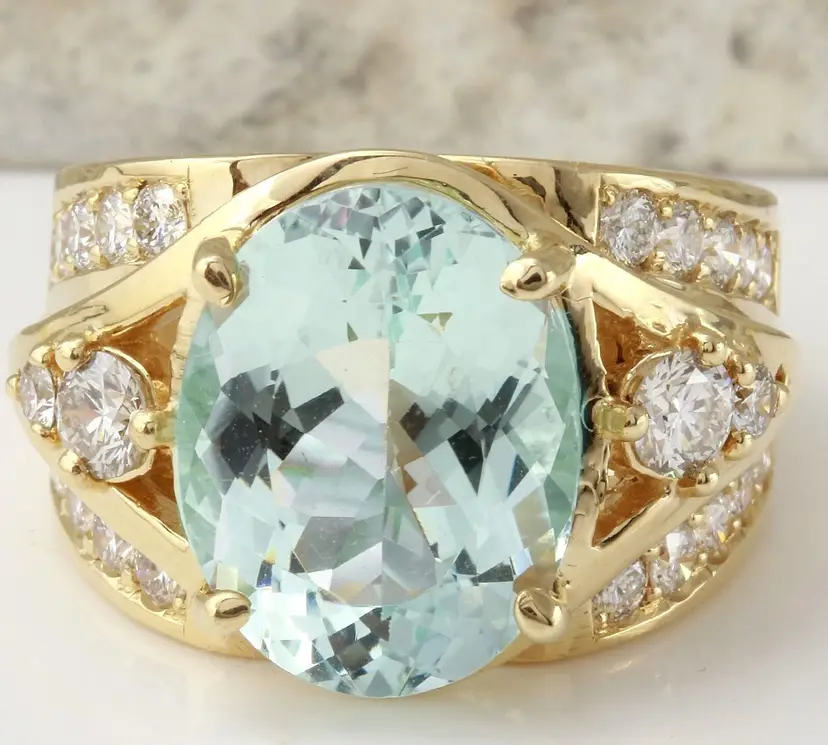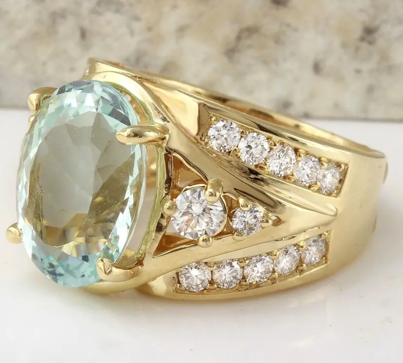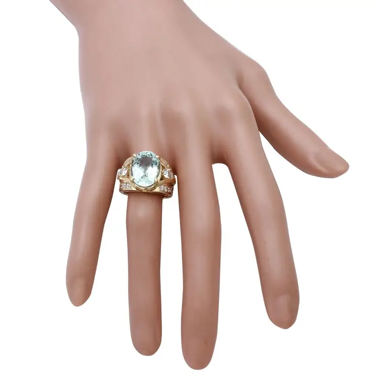 Main Stone Color: Blue Main Stone Treatment: Heating Metal Purity: 14k solid gold Main Stone: Aquamarine Sizable: Yes Main Stone Creation: Treated Metal: Yellow Gold Ring Size: 7 Total Carat Weight (TCW): 7.71 Main Stone Shape: Oval Brand: Unbranded Type: Ring