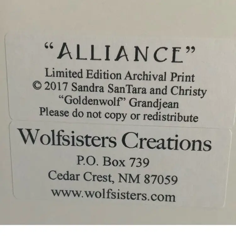 In great condition. This artwork is a matted print of the "Dragon White Wolf Alliance" design by Wolfsisters Graphix, a collaboration between Sandra SanTara and Christy Grandjean Wolfsisters Creations P.O. Box 739 Cedar Crest, NM 87059 www.wolfsisters.com