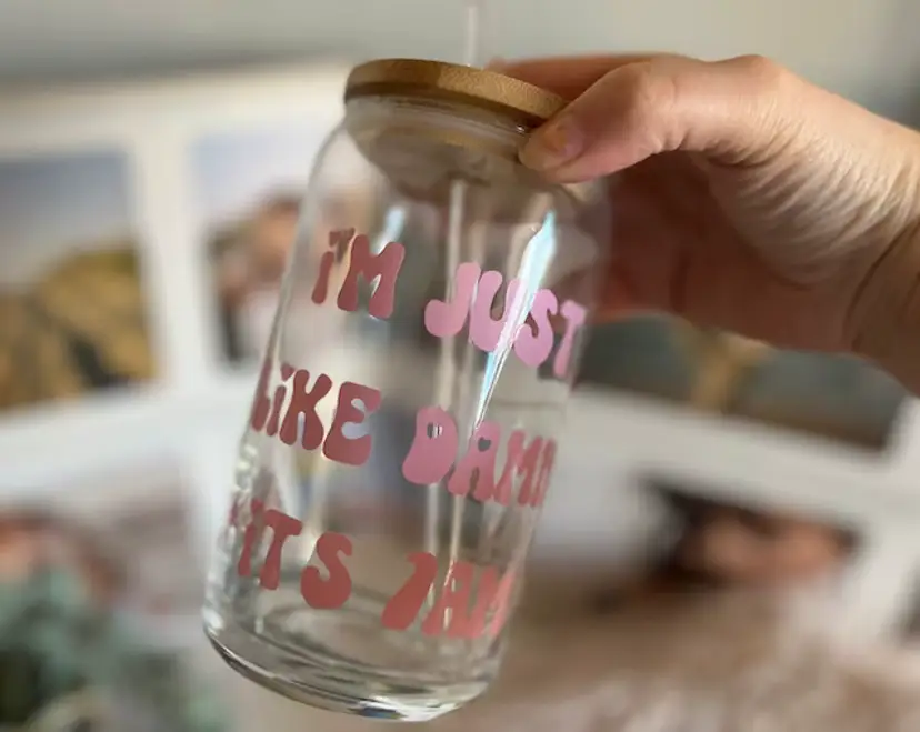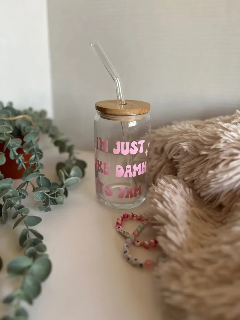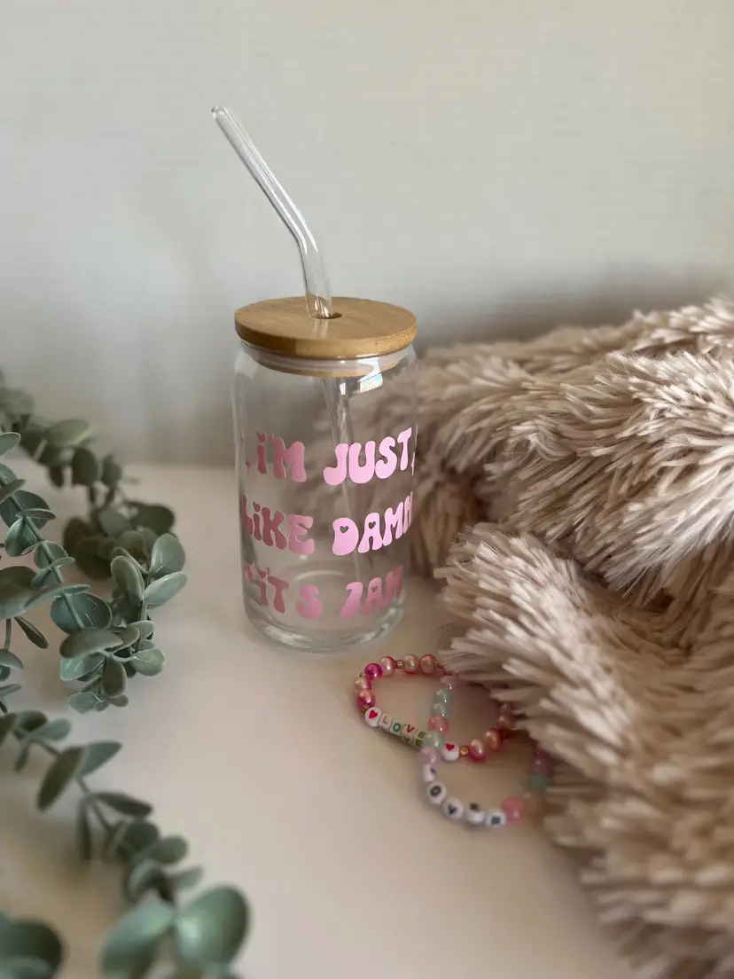 "I'm just like damn it's 7am" 16 oz glass tumbler with bamboo lid. This is handmade by me and is the perfect cup for your morning iced coffee, matcha latte, or anything that you are drinking to wake you up and conquer your day!