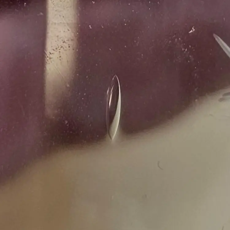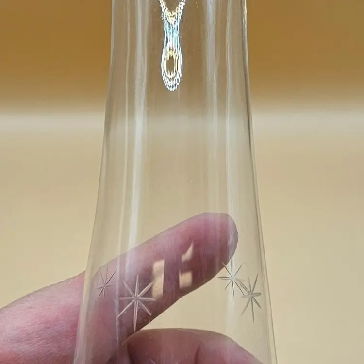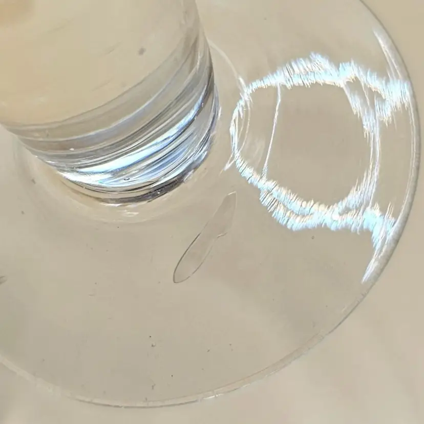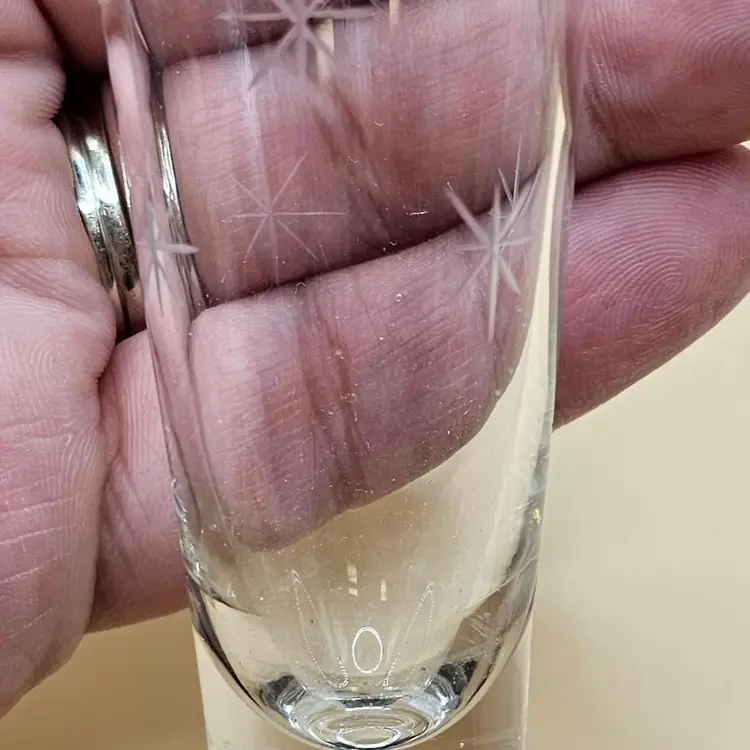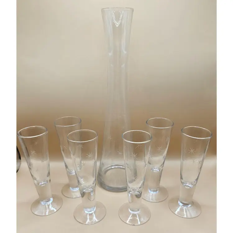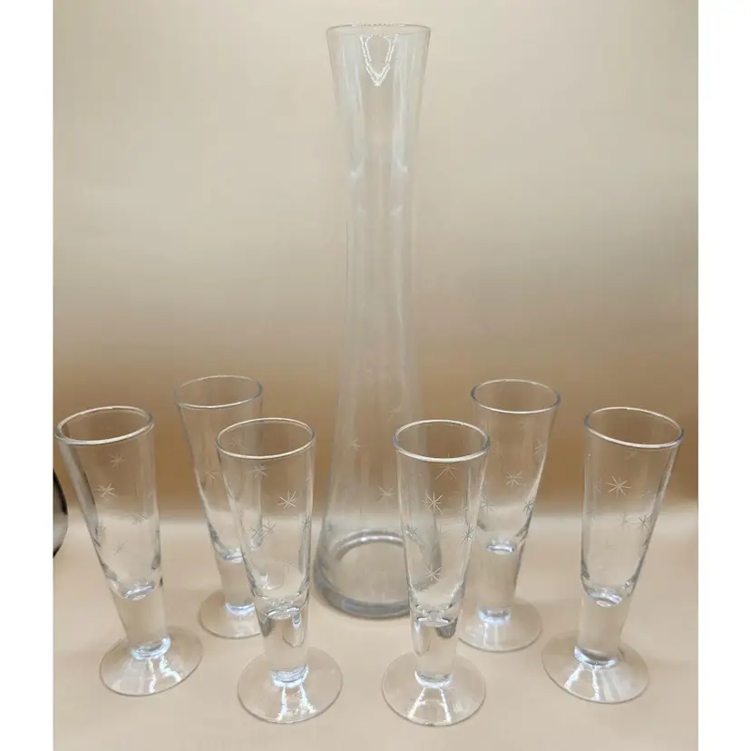 No makers mark. Some bubbles in glass (none broken or on the surface) and light surface scratches. One glass has a chip on base but no other chips or cracks. Glasses: 5" tall Pitcher: 10.5" tall