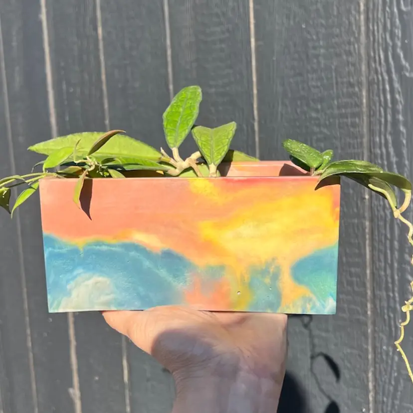 Hand poured concrete rectangle planter using various dyes for color. Drainage added upon request.