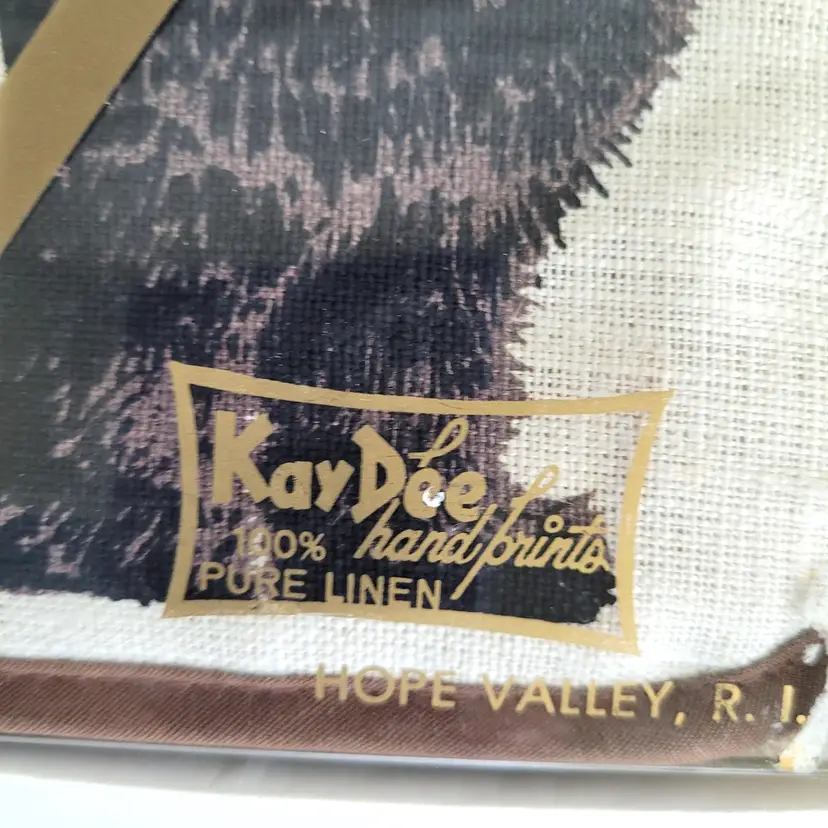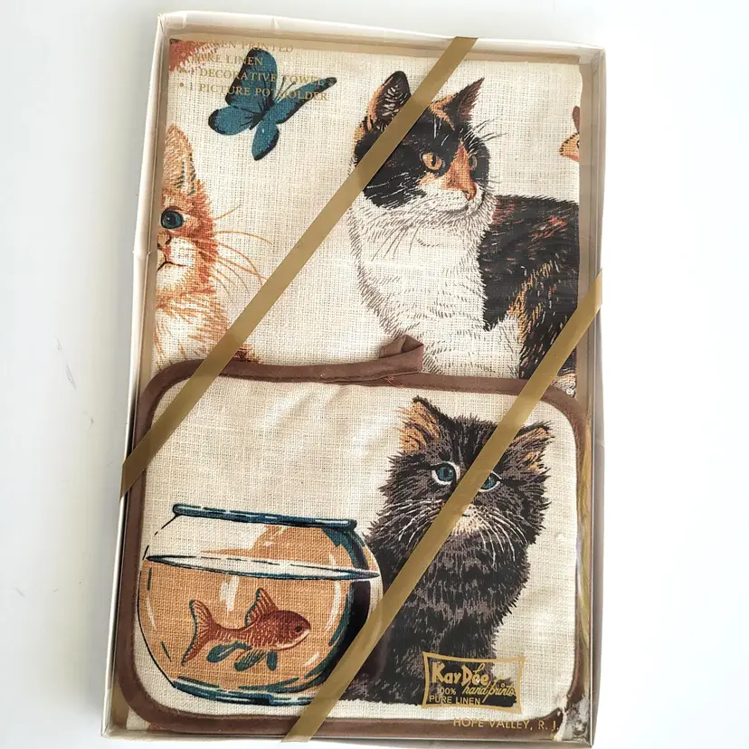 This adorable set is new and has never been opened (Deadstock). It contains 2 screen printed items in 100% Linen. It says there is 1 towel and 1 potholder. I do not know what the size of the towel is since I did not take it out. The potholder measures 8.5" x 6.5". Each has a pretty screen print of kitty cat theme artwork.